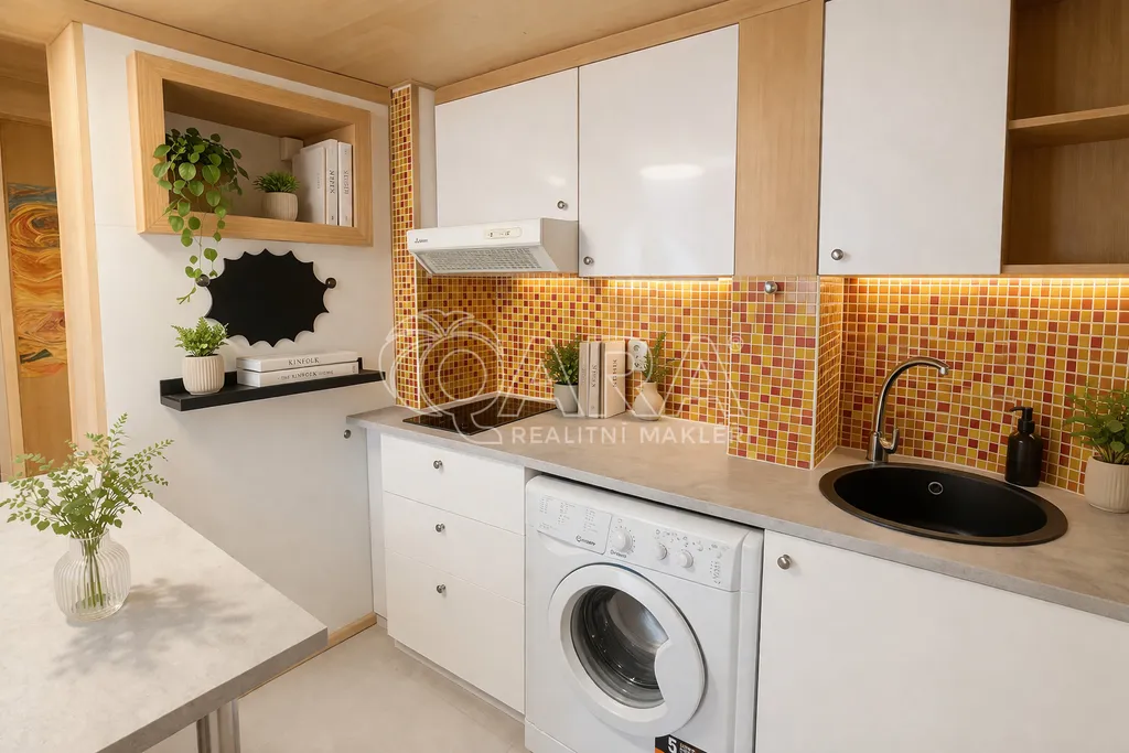 Jedná se o vybavený byt v podkroví historické budovy s výtahem. Vybavená kuchyňská linka, koupelna s pračkou, postel, prostorná skříň i bar se židlemi. Jednotka je vhodná pro jednu, maximálně dvě osoby.