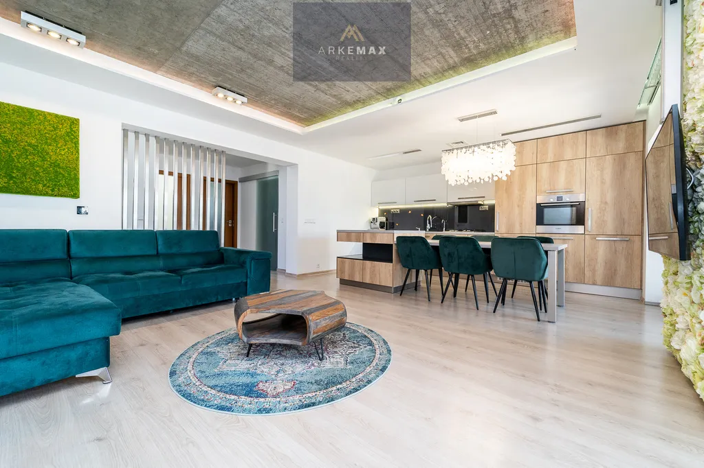 Dům nabízí promyšlené dispoziční řešení s důrazem na komfort a soukromí. Dominantou je prostorný obývací pokoj propojený s kuchyní a jídelnou. Nemovitost je kompletně zařízená kvalitním nábytkem a spotřebiči.