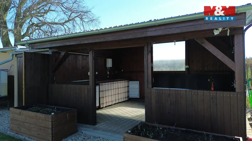 Pergolu s kuchyňským koutkem a s posezením 20 m². Garáž 8,16 m² a zahradní domek 20,06 m² s možností předělat na ložnici. Vrt na vodu hluboký 24 m. Zpevněnou příjezdovou cestu.