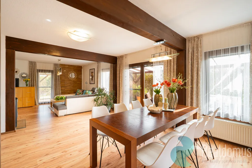 Dům o dispozici 5+kk je díky velkým oknům a přívětivé orientaci prosvětlený a vzdušný a nabízí dostatek prostoru i pro větší rodinu. V přízemí se nachází hlavní obytný prostor, který tvoří spojení prostorné kuchyně (17,70 m²), haly s jídelnou (16,07 m²) a obývacího pokoje s kamny (17,03 m²). Dále zde najdeme pokoj/pracovnu 10,77 m², koupelnu s toaletou (3,01 m²), komoru 2,27 m² a zádveří (3,29 m²). Podkroví tvoří odpočinkovou část domu, je zde hala 11,08 m² a tři samostatné neprůchozí pokoje (13,29 m², 19,06 m², 20,12 m²), dále koupelna s vanou a sprchou (8,55 m²) a samostatné WC (2,27 m²).