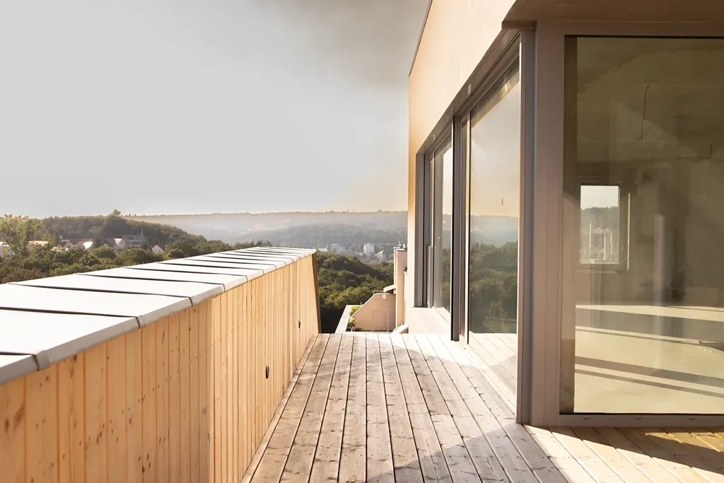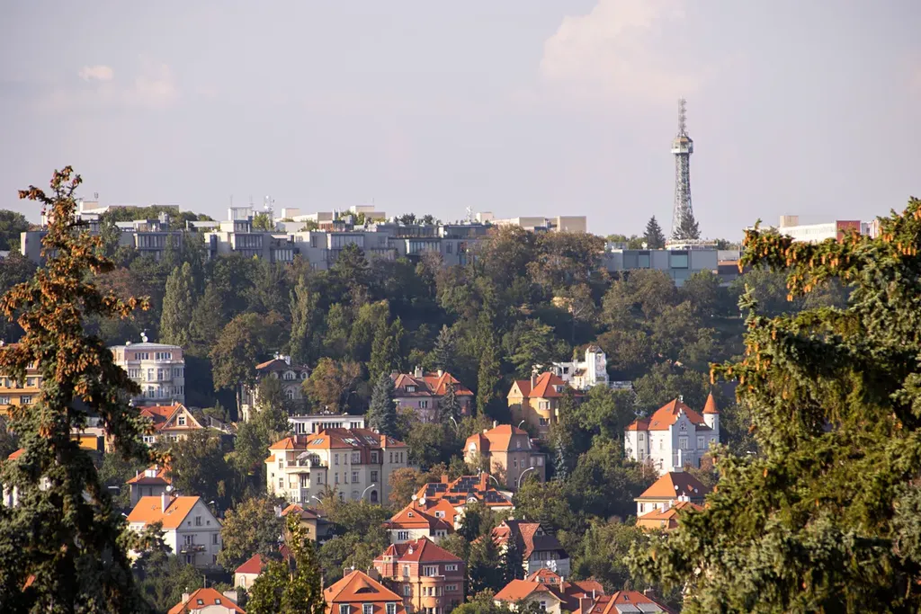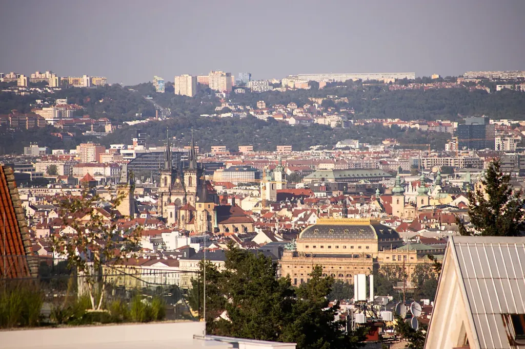 Skutečným vrcholem celé rezidence je však privátní střešní terasa o rozloze 105 m² s vířivkou a naprosto jedinečným výhledem na pražské panorama – od ikonického V-Toweru, přes historické centrum Starého Města, až po Petřín a Strahov.