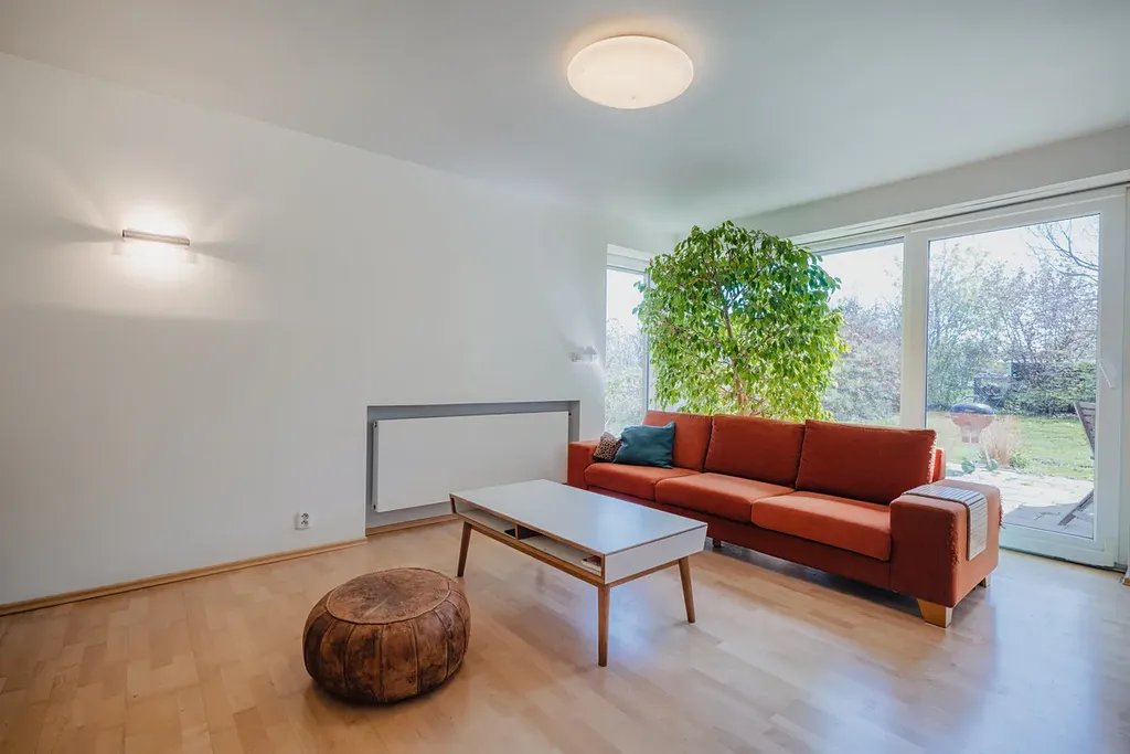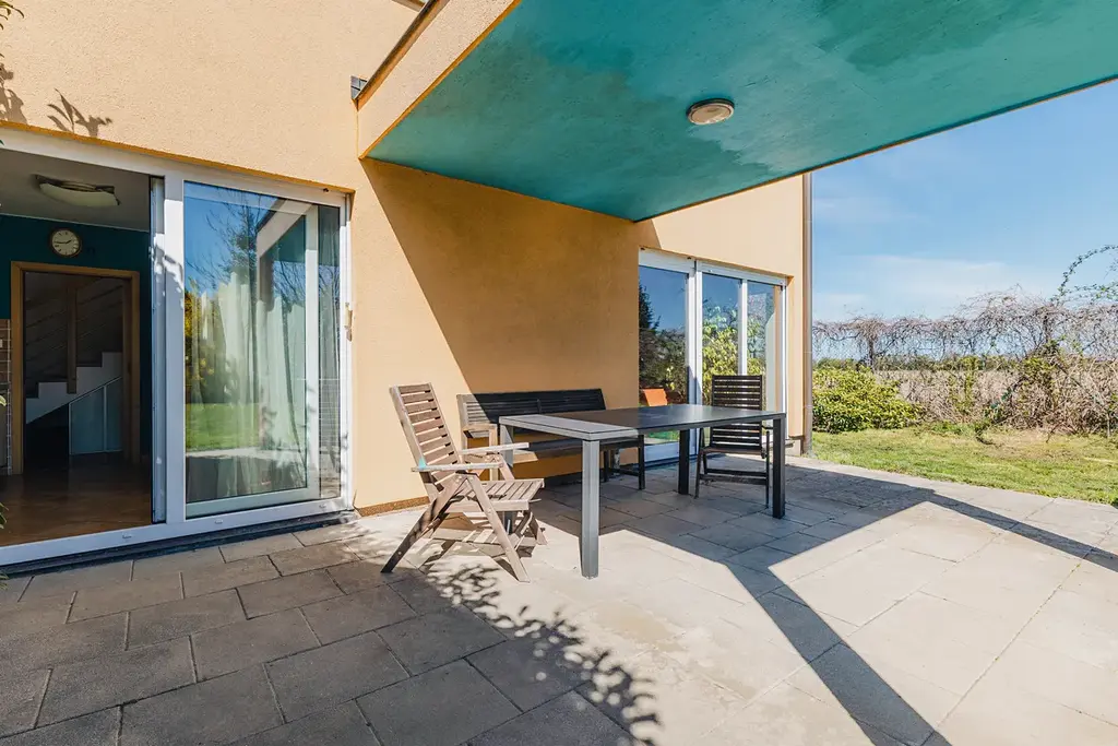 • Přízemí: světlý obývací pokoj s krbem a přímým vstupem na venkovní terasu s posezením, jídelna propojená s plně vybavenou kuchyní, pokoj (vhodný např. jako pokoj pro hosty nebo pracovna), koupelna s kuchyňským koutem, technická místnost a garáž pro dvě auta.