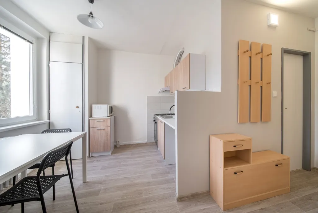vstupní předsíň, sádrokartonové jádro (koupelna se sprchovým, umyvadlem a WC), kuchyň (PVC), pokoj (parkety a koberec) s výstupem na lodžii, sklepní box umístěný v přízemí domu. Dům je zateplen, má novou fasádu a plastová okna. Volné ihned. Průkaz energetické náročnosti budovy: třída C.