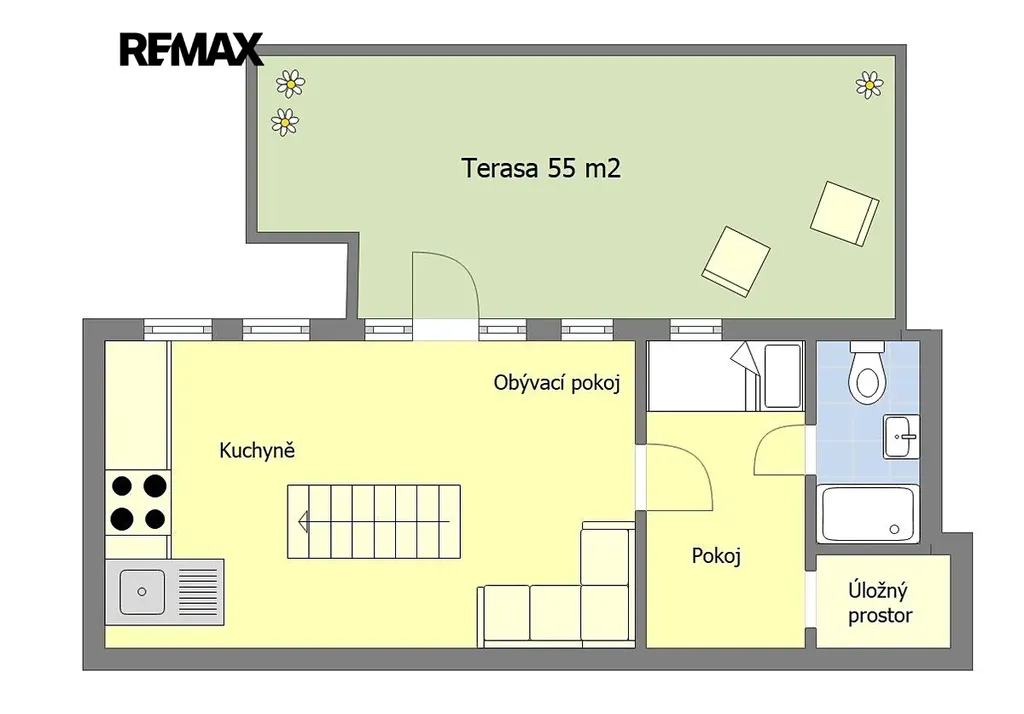 Ve všech prostorách jsou okna, která poskytují dostatek světla v místnostech. Nachází se zde i praktická komora. Ve vstupní hale je točité dřevěné schodiště, které vede do horní části prostor s velkou otevřenou místností s kuchyňským koutem a místností s vlastní koupelnou.