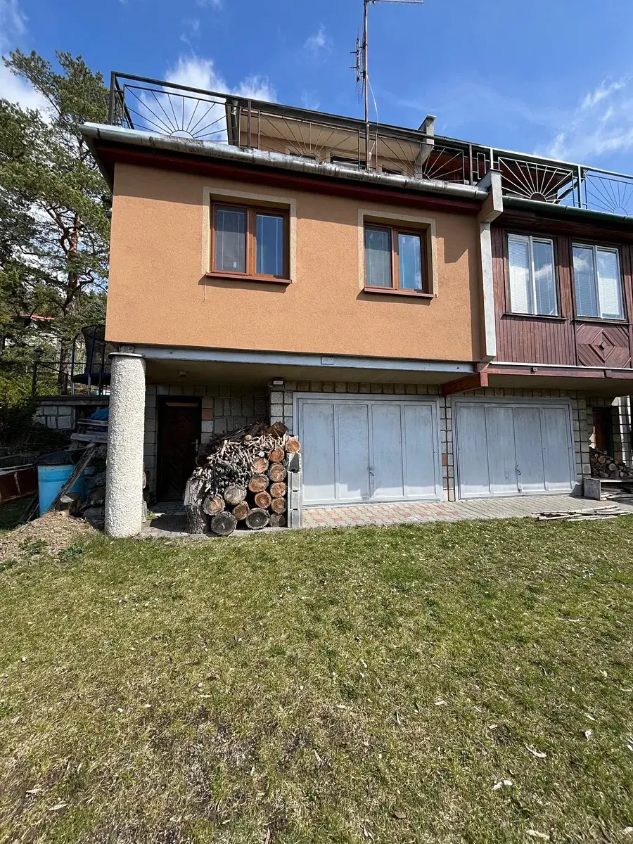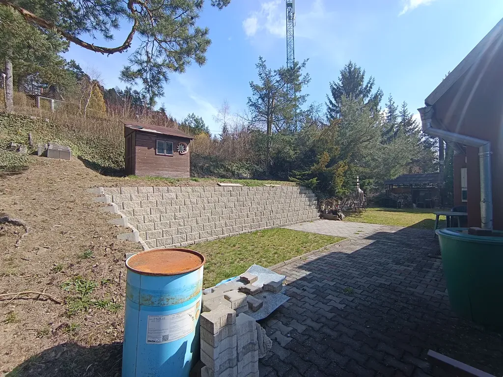 Z čelní strany chaty je vstup do garáže a sklepního prostoru, poskytující dostatek úložného místa například pro zahradní techniku nebo sportovní vybavení. Součástí nemovitosti je také zahrada, situovaná v mírně svažitém terénu. Celková výměra pozemku 426 m2.