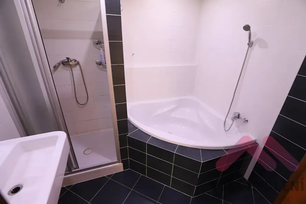 Byt se nachází v 2.NP novostavby s orientací do volného prostoru a na zeleň. K dispozici jsou po vstupu do bytu dvě samostatné ložnice, samostatná šatna a toaleta. Z chodby je taktéž přístupná prostorná koupelna kde naleznete jak rohovou vanu tak i sprchový kout spolu s pračkou. Prostorný obývák je spojen s kuchyňským koutem, zařízeným novými spotřebiči, jako : horkovzdušná trouba, mikrovlnka, sklokeramická deska, americká - dvoukřídlá lednice s výrobnou ledu a myčka. Neopomenutelnou výhodou tohoto bytu je i samostatná garáž v suterénu domu se zamykatelnými vraty. Cena bytu včetně garáže je 29.500,-Kč + služby 5.000Kč + elektřina se převádí na nájemníka. Volné ihned!