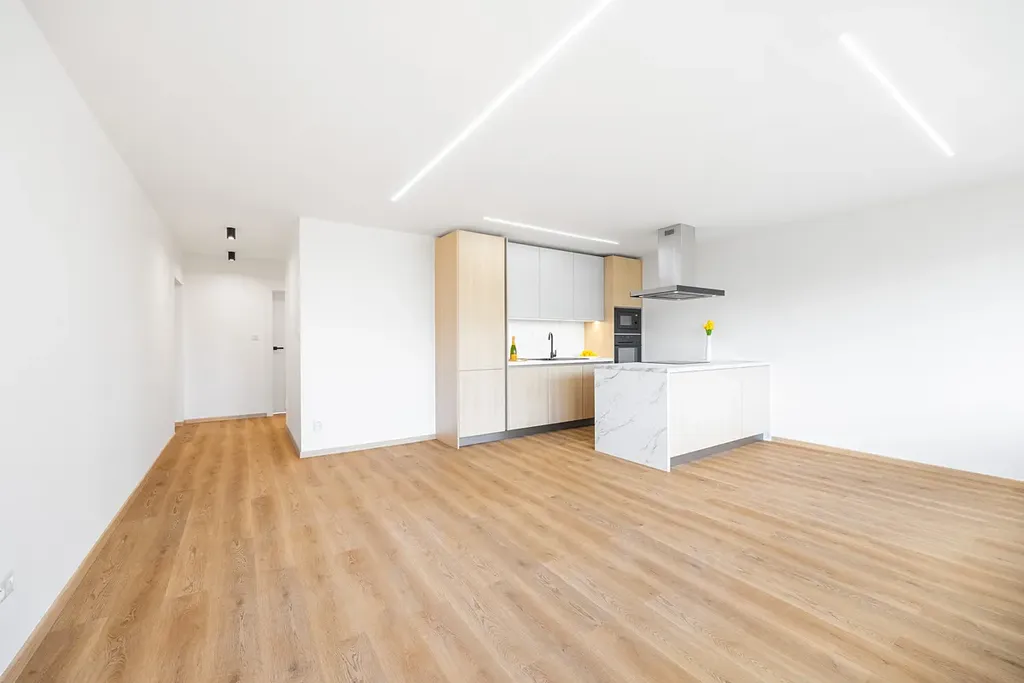 Byt vypadá přesně jak vidíte na fotografiích, nejedná se o vizualizaci. Kuchyně s ostrůvkem je vyrobena na míru a kompletně vybavená spotřebiči (elektrická trouba, mikrovlnná trouba, indukční deska, myčka). Kuchyně je krásně prosvětlená velkými okny v prostorném obývacím pokoji a tvoří tak příjemný a rozsáhlý prostor pro rodinu. Koupelna je s vanou, sprchovým koutem, podlahovým topením a designovým umyvadem na praktické skříňce se dvěma zásuvkami. Samostatná toaleta má vlastní umyvadlo. V chodbě je prostor na vestavěnnou skříň a dostatek úložných prostor.