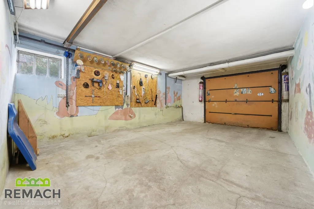 V suterénu domu se nachází garáž i pro auta dnešních rozměrů, zadní prostor a kotelna. Další auta i třeba karavan zaparkujete pohodlně před domem přes cestu na zpevněné a vydlážděné ploše.