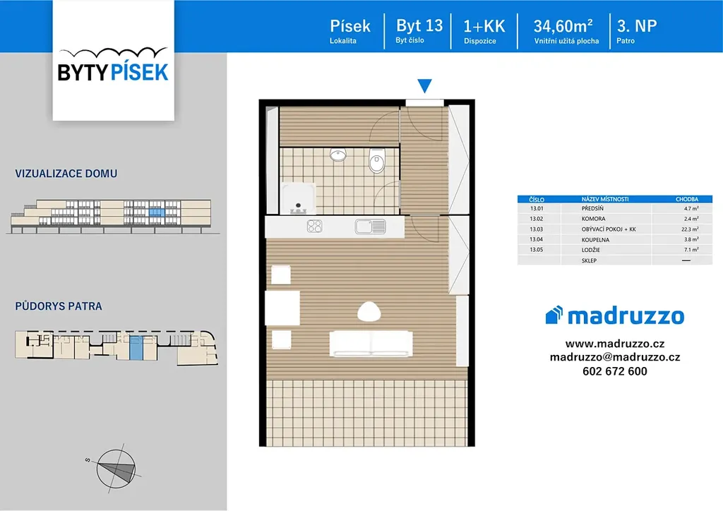 Nabízíme Vám prakticky řešený byt č. 13 o dispozici 1+kk a velikosti 34,6 m2 s prostornou lodžií o velikosti 7,1 m2 umístěný ve 3. NP. Ideální bydlení pro páry anebo jako koupě na investici.