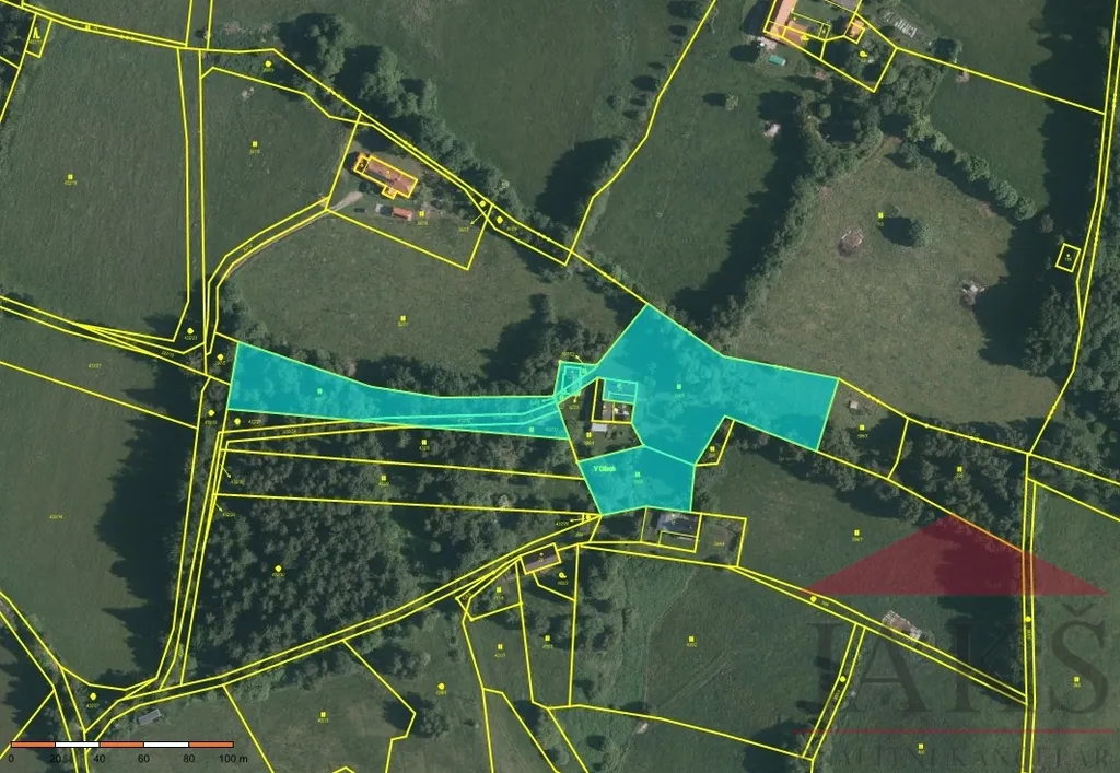 Pozemky u stodoly: 2.910 m2; Pozemky s nálety (palivové dřevo) a příjezdovou cestou s parkovištěm.