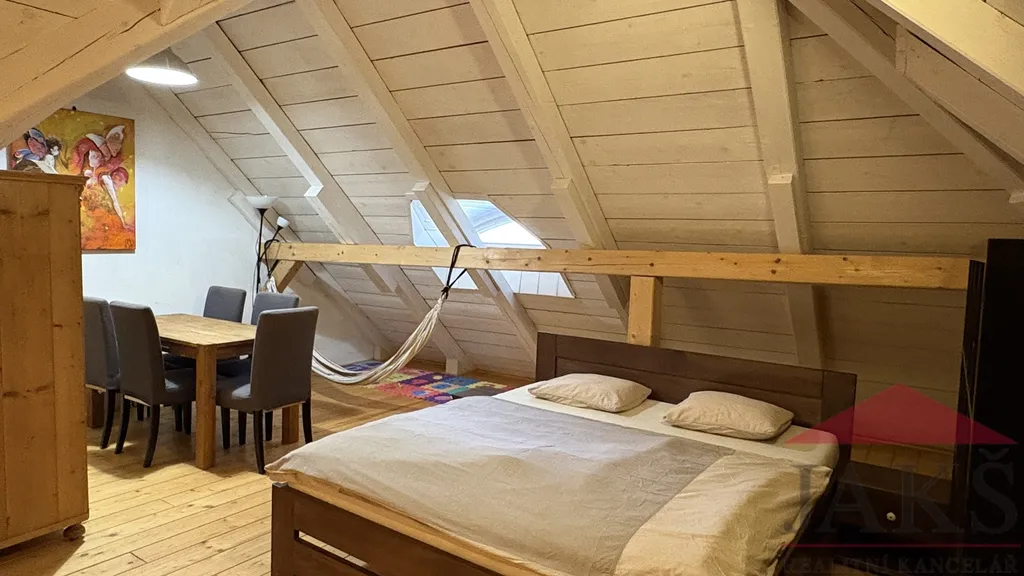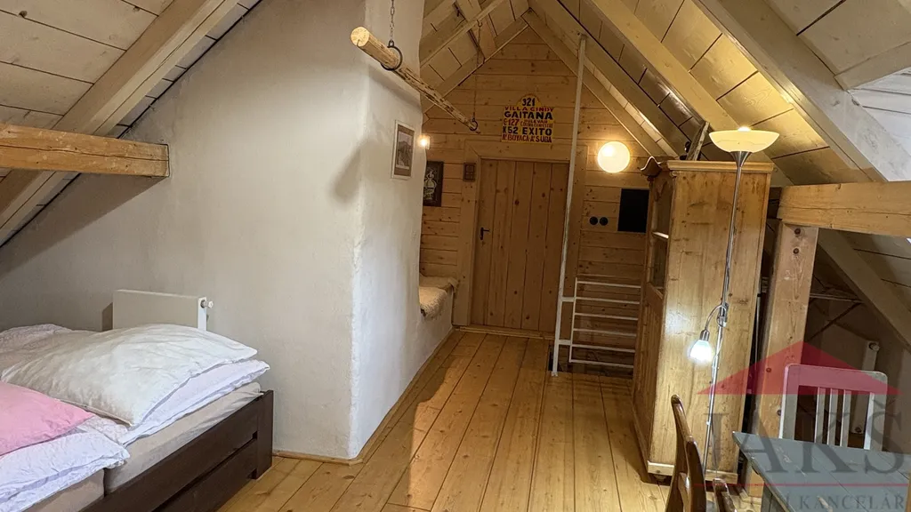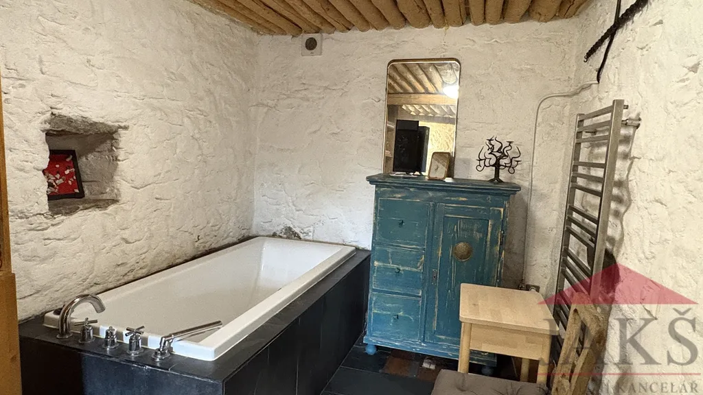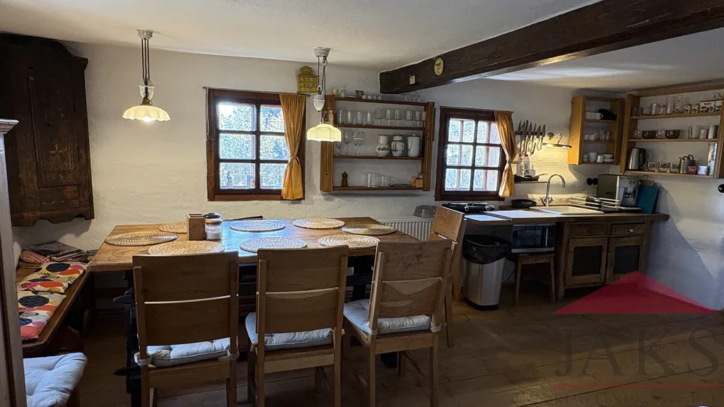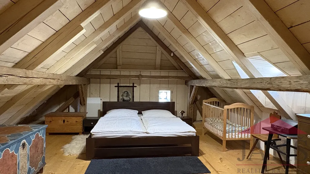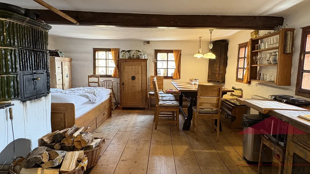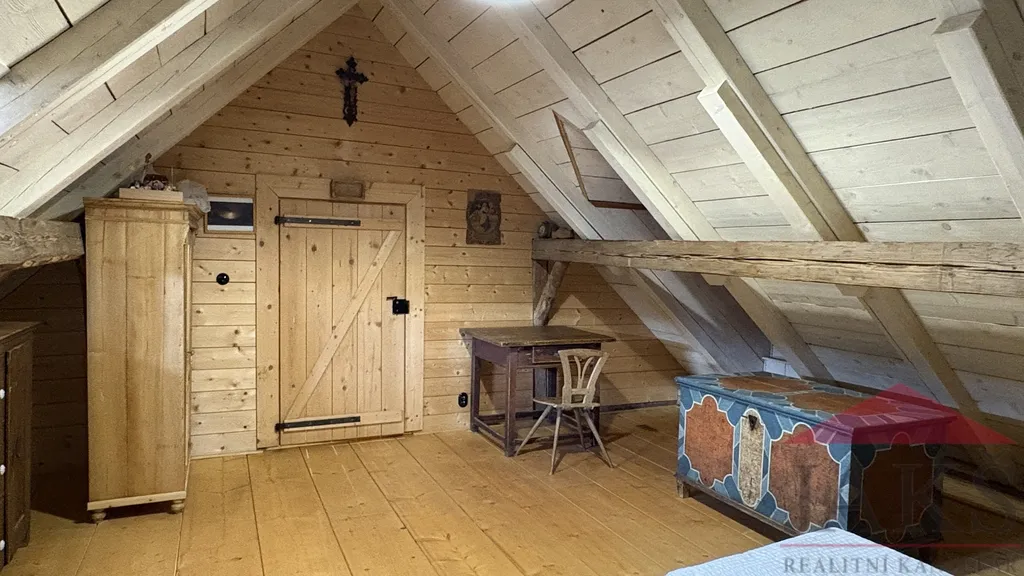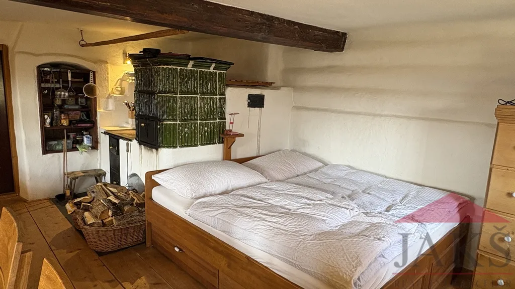 Popis: obnovené kamenné zápraží s posezením, přízemí: chodba (schody do podkroví), dochovaná černá kuchyně s pecí a udírnou (elektrokotel), prostorná obytná světnice s kachl. kamny s troubou, pecí s lehárnou a kuch. linkou, moderní koupelna (vana, umyv., WC, topný žebřík, podl. topení); podkroví: průchozí obytná hala, 2x velká ložnice. Dům zajištěn alarmem.