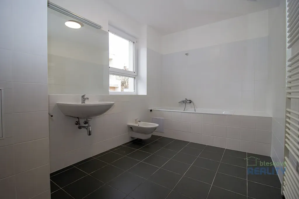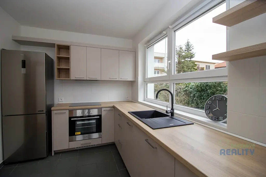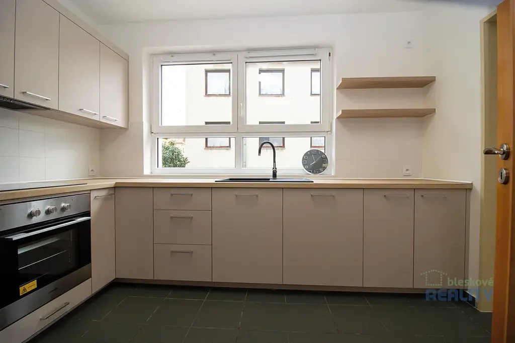 Interiér bytu je nezařízený, což umožňuje novému nájemci přizpůsobit si prostor dle vlastních představ. Dominantou bytu je zcela nová, moderní kuchyňská linka vybavená kvalitními spotřebiči – indukční varná deska, trouba, myčka nádobí a prostorná lednice s mrazákem. Koupelna disponuje vanou, toaleta je řešena samostatně. Balkon poskytuje příjemný prostor k odpočinku.