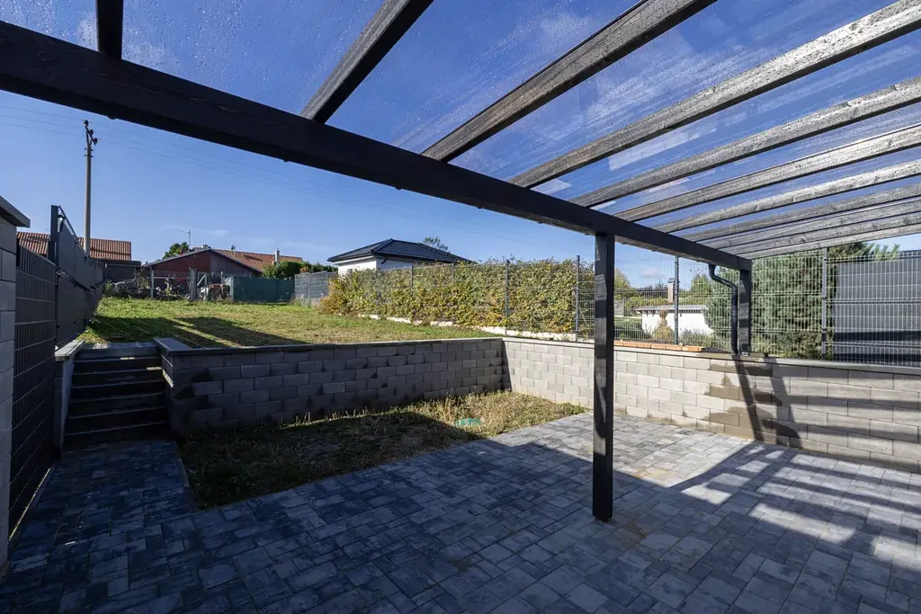 Obrovskou výhodou je fakt, že jsou u domu dokončeny veškeré venkovní úpravy (kromě finální výsadby zahrady). Přístřešek pro auta, kompletní oplocení, opěrná zídka s vydlážděnou terasou za domem, která je zastřešená pergolou.