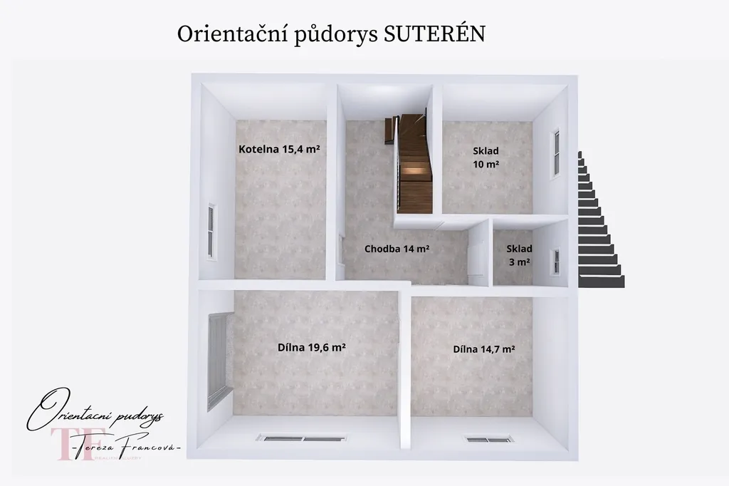 Suterén poskytuje dostatek prostoru pro technické zázemí, dílnu, sklad či kotelnu.
