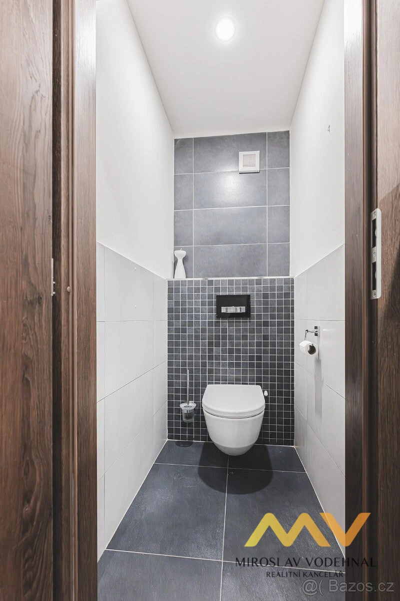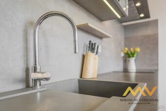 Kuchyňská linka je vybavena vestavěnými spotřebiči (myčka, indukční varná deska, digestoř, lednice s mrazákem) a praktickou spižírnou. Byt se pronajímá částečně vybavený – zůstává veškerý vestavěný nábytek.