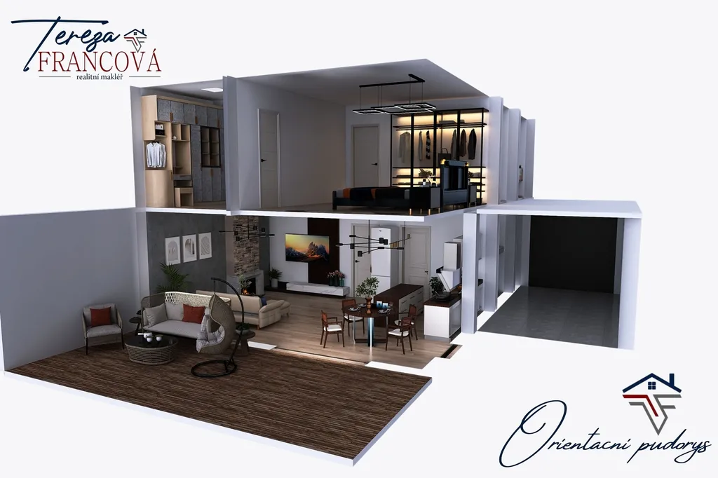 Dispozičně je dům velmi promyšlený. V přízemí se nachází prostorný obývací pokoj s krbem, kuchyňským koutem a přímým vstupem na zastřešenou terasu a zahradu. Velkým benefitem jsou velkoformátová okna, díky nimž interiér působí vzdušně a světle a máte pocit, že jste neustále součástí zahrady. V přízemí dále najdete vstupní chodbu, koupelnu a pokoj, který může sloužit jako pracovna, pokoj pro hosty nebo ložnice.