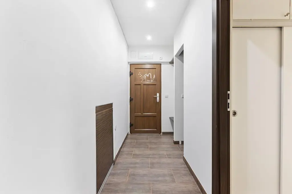 Dispozice nabízí prostorný obývací pokoj, samostatnou kuchyň s oknem a koupelnu s WC, která má rovněž své okno což je u tohoto typu bytů velmi výjimečné. Zvětšená koupelna disponuje masážní vanou. Významným bonusem je samostatná šatna v předsíni, druhá menší šatna je navíc v ložnici.