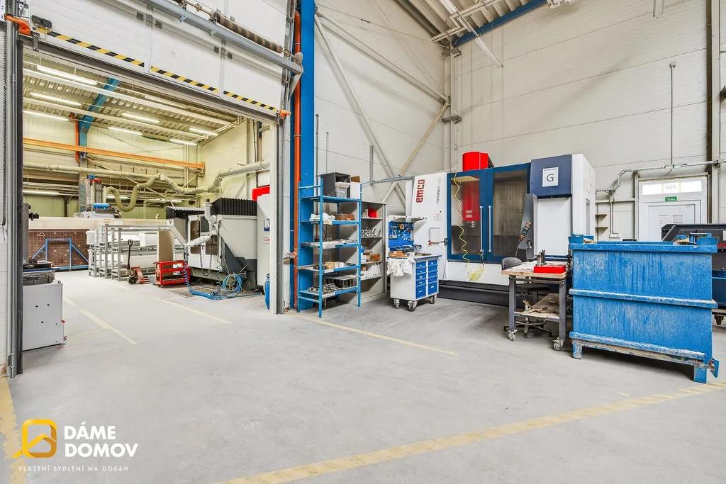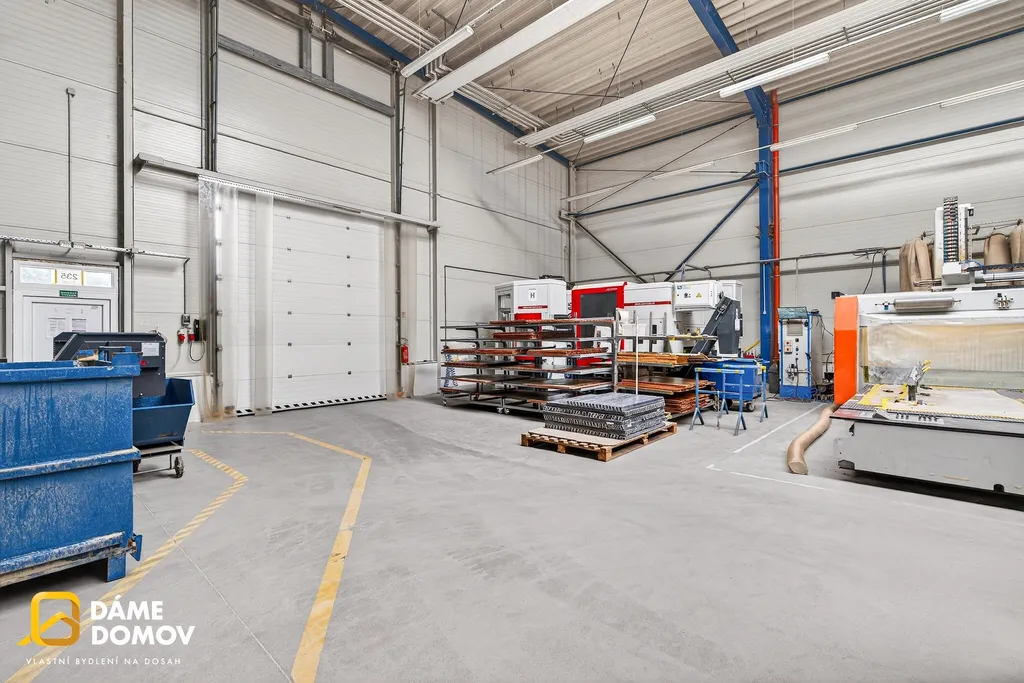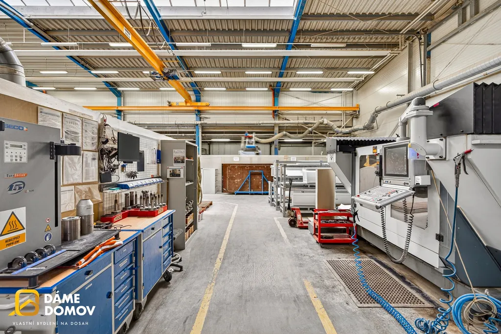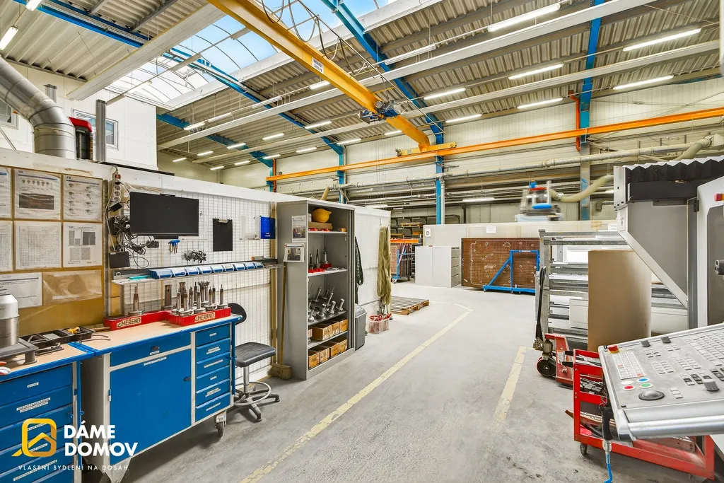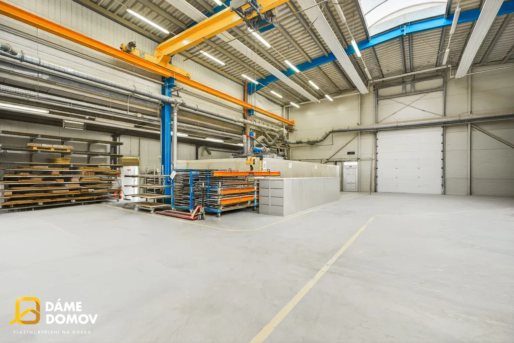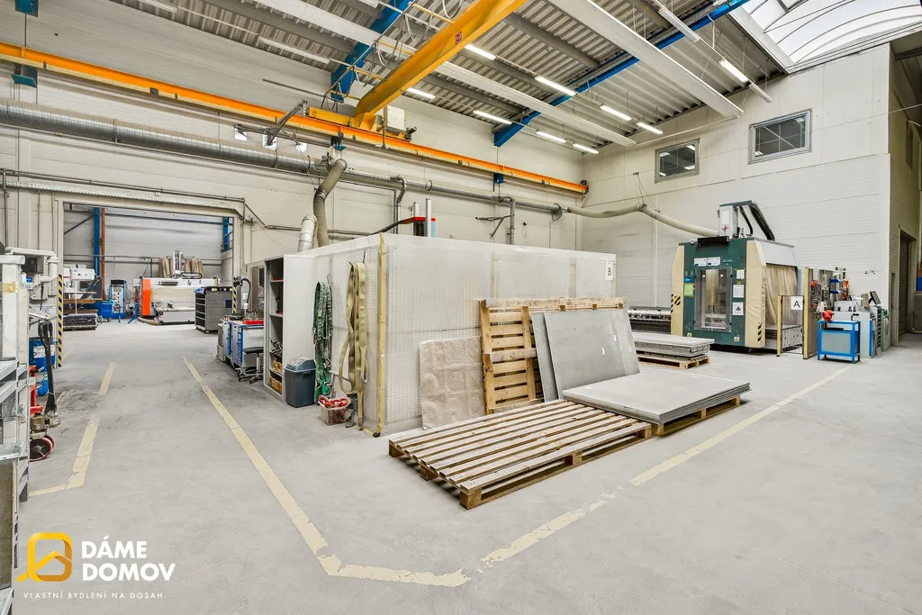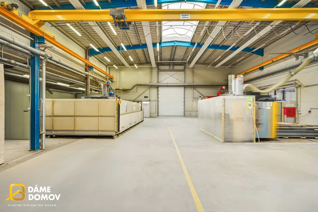 Přímo v hale se nachází jeřáb, který výrazně usnadňuje manipulaci s těžkými břemeny a zvyšuje efektivitu provozu.