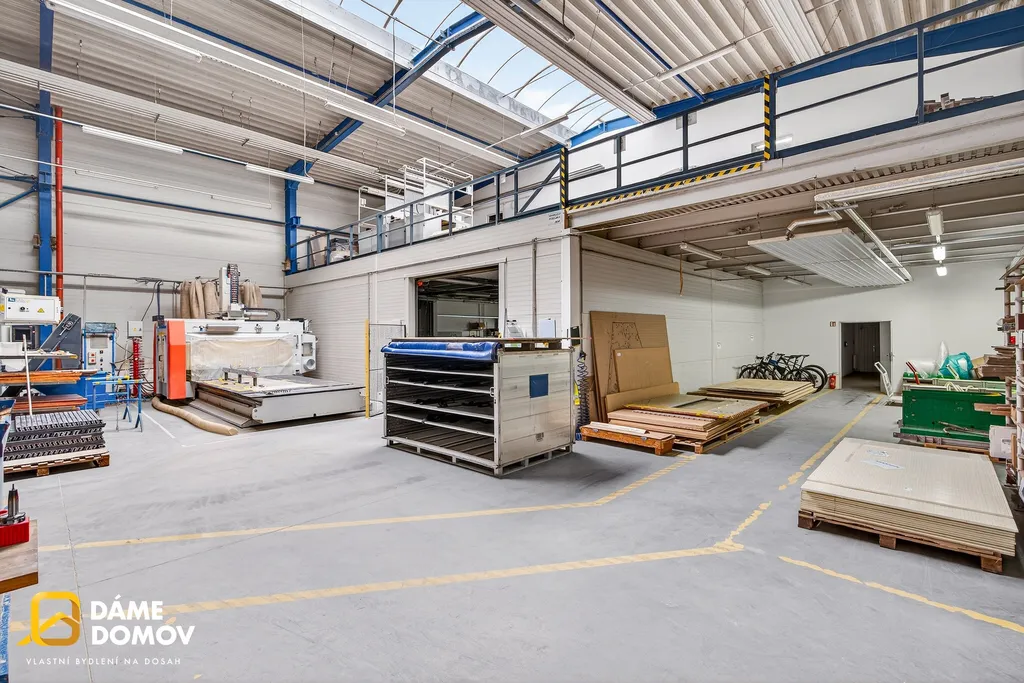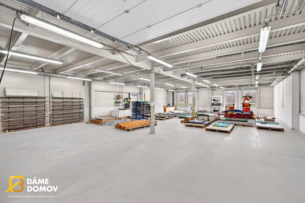 Součástí objektu je také administrativní zázemí v patře, kde najdete kanceláře, jídelnu i sociální zařízení – vše potřebné pro pohodlný chod firmy na jednom místě.