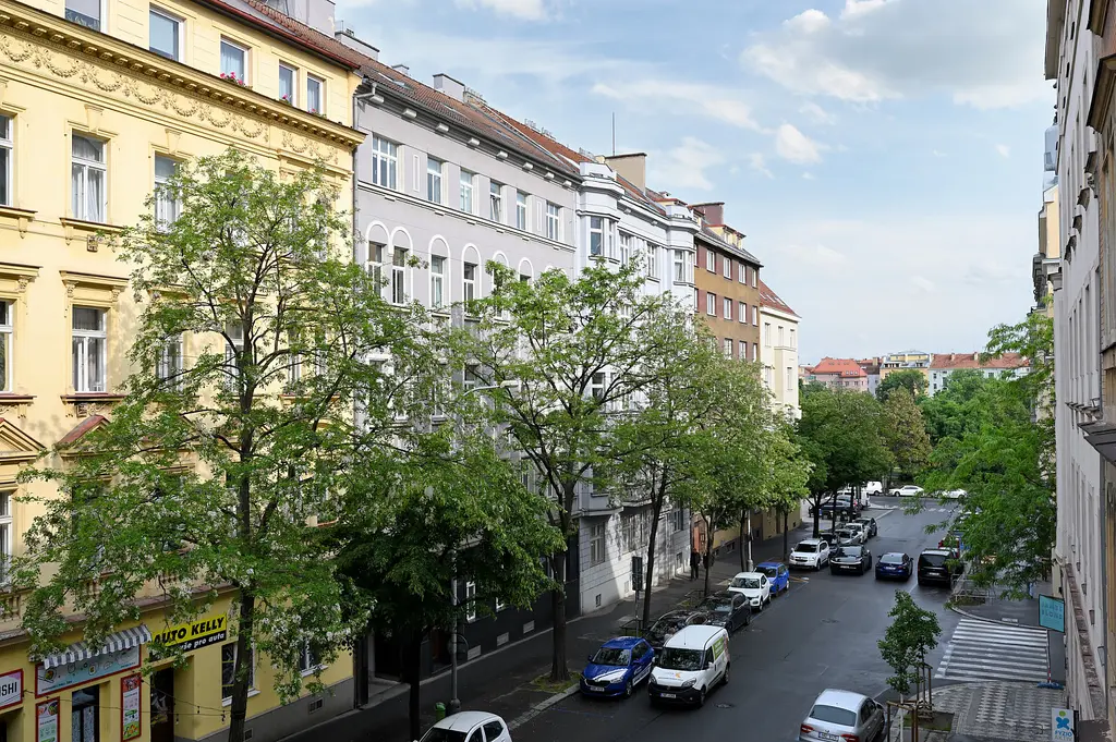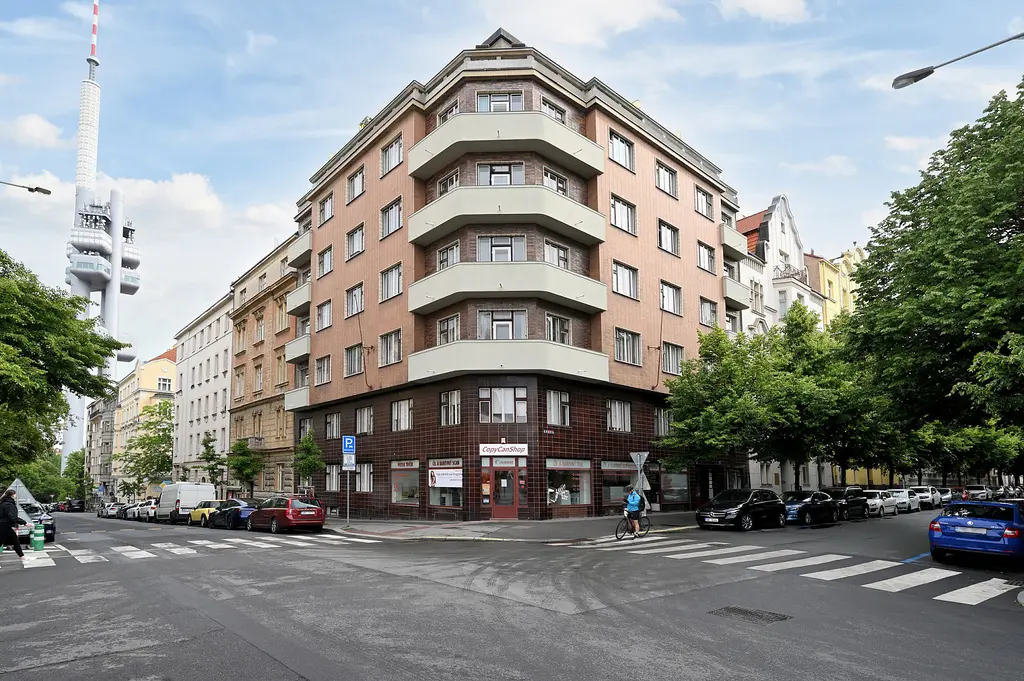 We offer for rent a very nice, spacious and fully furnished apartment in a house constructed in 1930's near Náměstí Jiřího z Poděbrad with a view of Plečnik's Church of the Sacred Heart of Jesus and in the immediate vicinity of the Metro A and tram stops. It is situated on the 2nd floor with elevator in a quiet street. Living area 82m² with central heating - two large living rooms with separate entrances from the living hall, this part of the apartment with wooden parquet floors, spacious, bright and fully furnished kitchen with appliances and washing machine, living hall in the middle of the apartment connects separate rooms with glass doors, children's room, bathroom with whirlpool massage bathtub, toilet and pantry/storage space. The apartment includes an open balcony, small hallway, apartment doors are eqipped with security lock. There are furniture, TV and built-in wardrobes for the tenant at his disposal.
