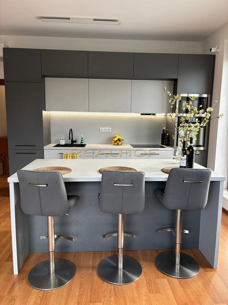 V bytě je nová kuchyňská linka se spotřebiči - varná deska, trouba, mikrovlnná trouba, myčka nádobí.