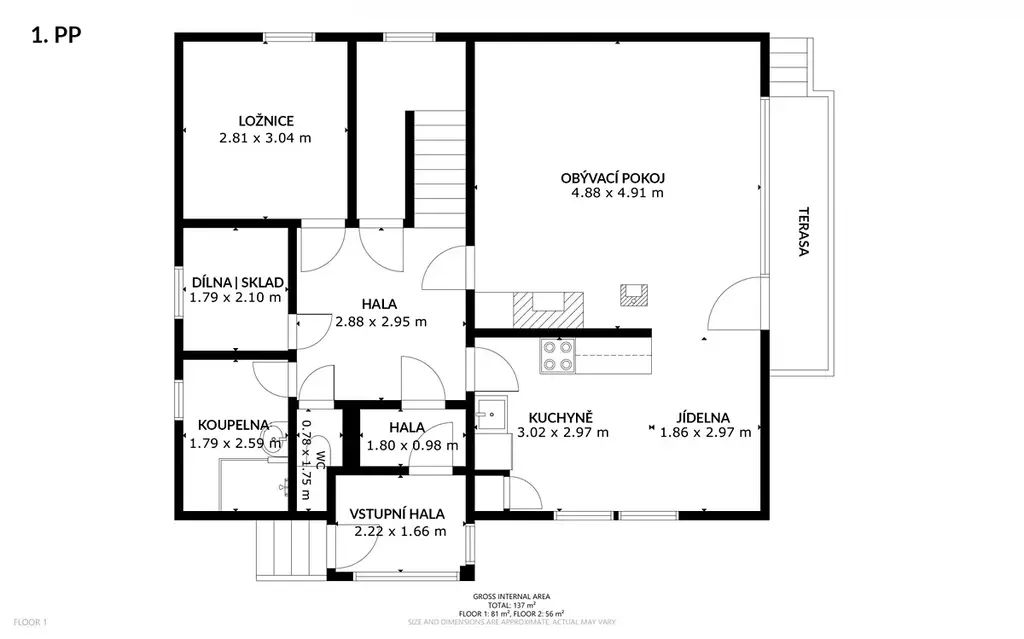 Přízemí (81 m2) zahrnuje prostorný obývací pokoj 24 m2 , na který navazuje jídelní kout a kuchyně 14,5 m2, samostatnou ložnici 8,50 m2, koupelnu, samostatné WC a vstupní halu s chodbami. Praktickou součástí je také menší místnost využitelná jako sklad nebo dílna.