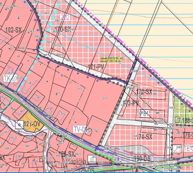 (Stávající výměra pozemků bude GP rozdělena na prodávanou výměru 5.077m2).