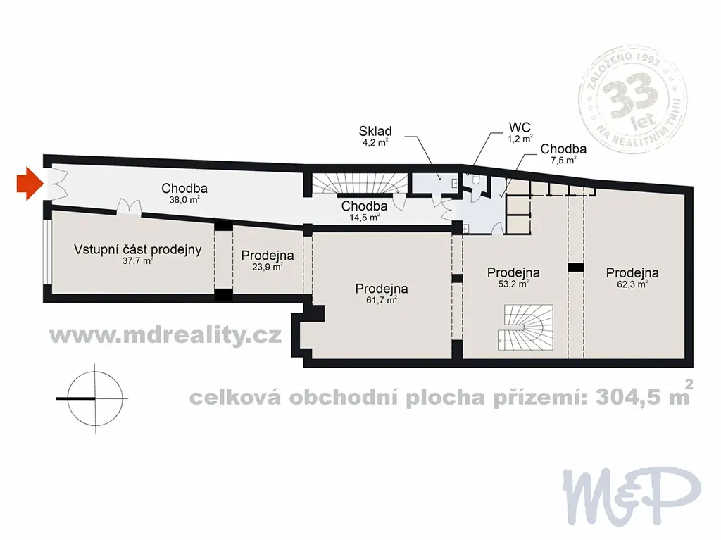 Nabízíme k pronájmu obchodní a kancelářské prostory o celkové výměře 520 m², situované v prestižní dolní části Masarykova náměstí v Jihlavě. Nemovitost se rozkládá v přízemí a prvním nadzemním podlaží, přičemž disponuje výraznými výlohami a okny orientovanými přímo do náměstí, což zajišťuje maximální viditelnost a přímý kontakt s intenzivním pěším provozem. Přízemí o ploše 304 m² nabízí velkorysý prodejní trakt, na který v patře navazuje dalších 216 m² variabilních prodejních či administrativních ploch včetně kompletního sociálního zázemí a skladových prostor. Prostory před rekonstrukcí umožňují individuální úpravy na míru, které může po vzájemné dohodě zajistit přímo majitel, nebo si je nájemce zrealizuje vlastní cestou. Díky své výjimečné rozloze, vysoké variabilitě a strategické poloze v historickém jádru města nabízejí tyto prostory široké možnosti komerčního využití od reprezentativního showroomu či prodejny až po rozsáhlé kancelářské sídlo firmy.
