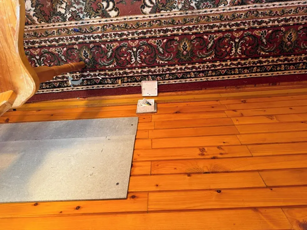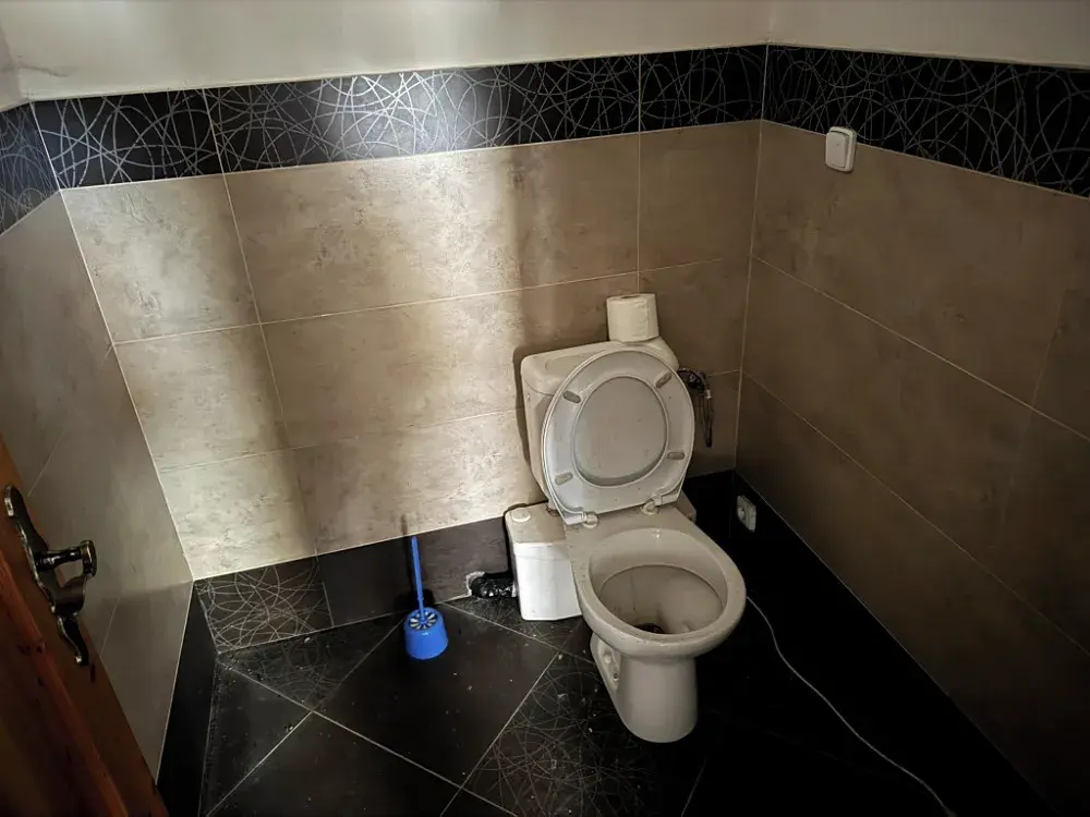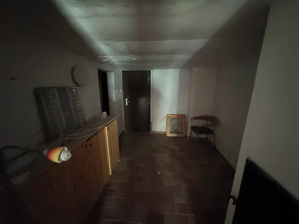 V některých místnostech jsou odkryty části krovu a podkrovních konstrukcí,což naznačuje rozpracovanost adaptace podkroví nebo výměny tepelněizolačních vrstev.