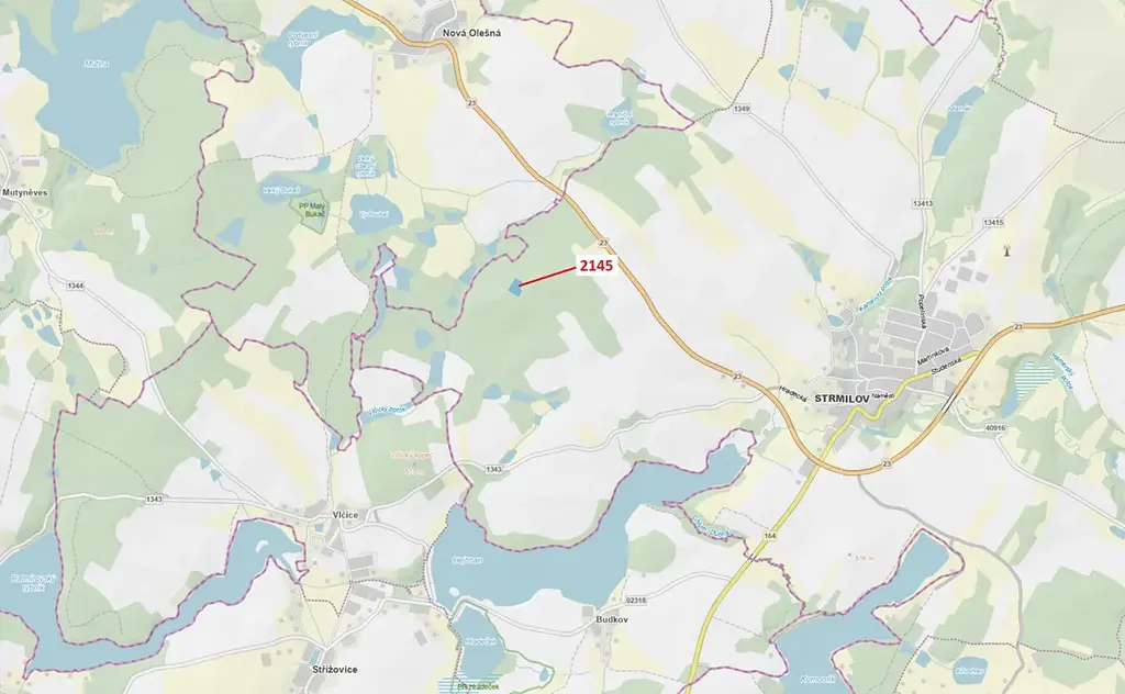 Lesní pozemek o výměře 5413 m2, parcelní číslo 2145, podíl 1/1, katastrální území Strmilov, obec Strmilov, obec s rozšířenou působností Jindřichův Hradec, okres Jindřichův Hradec, Jihočeský kraj.