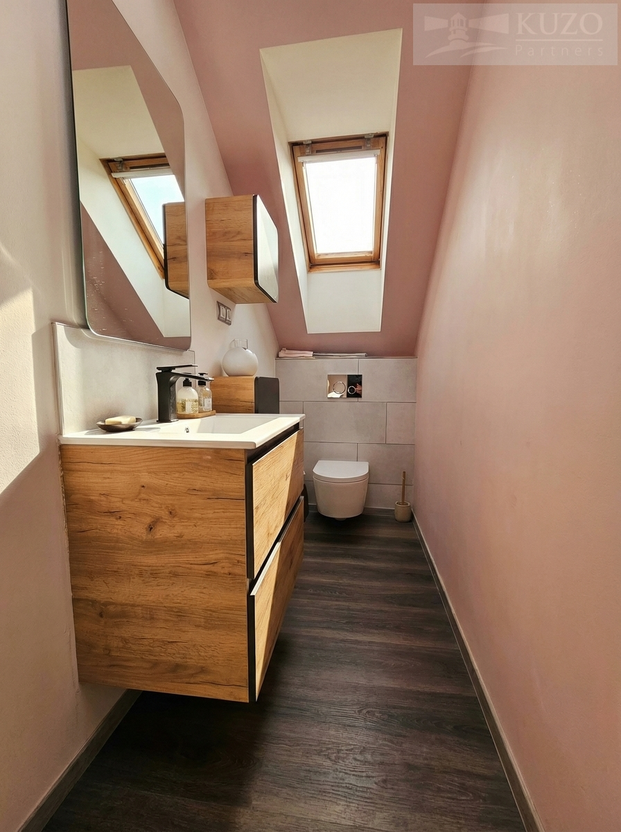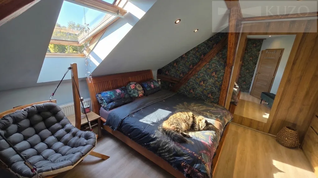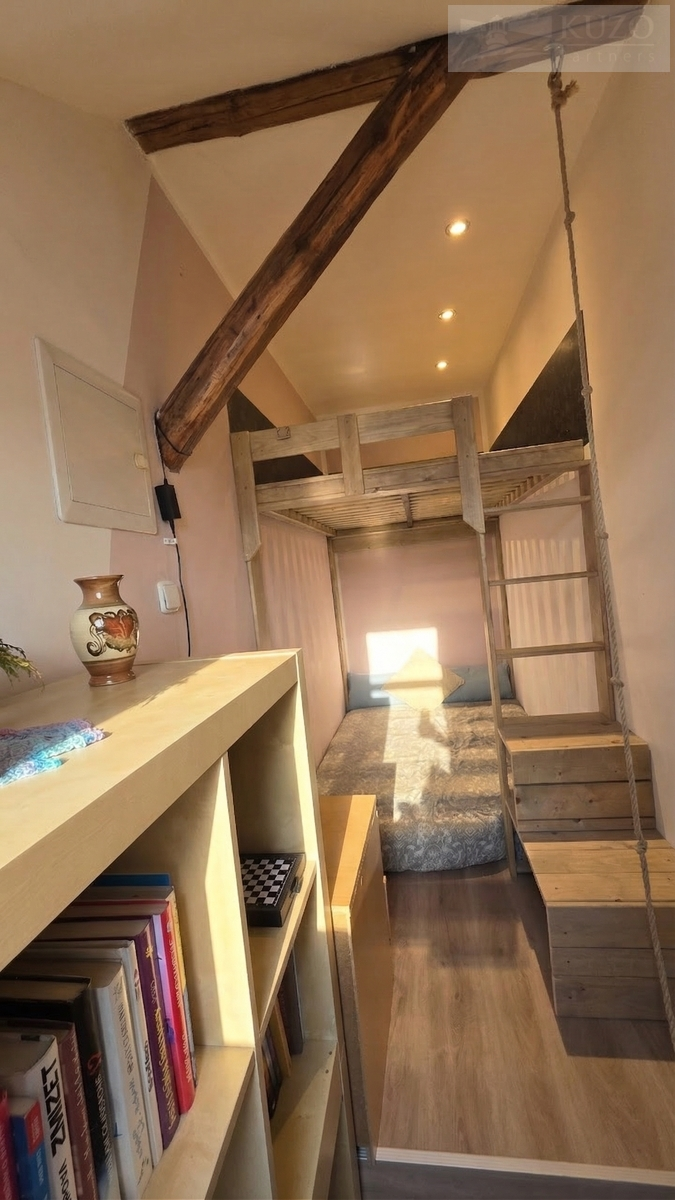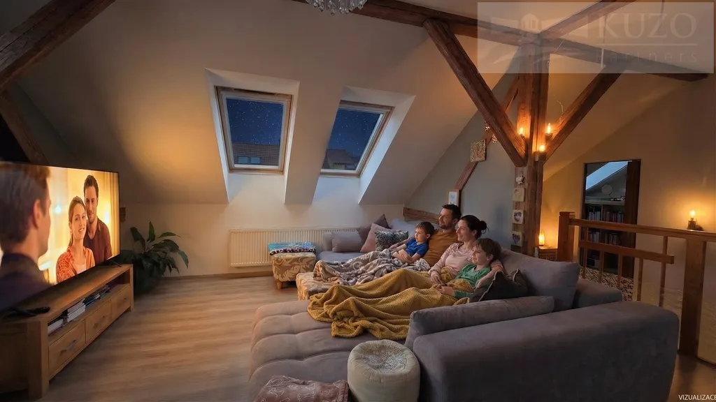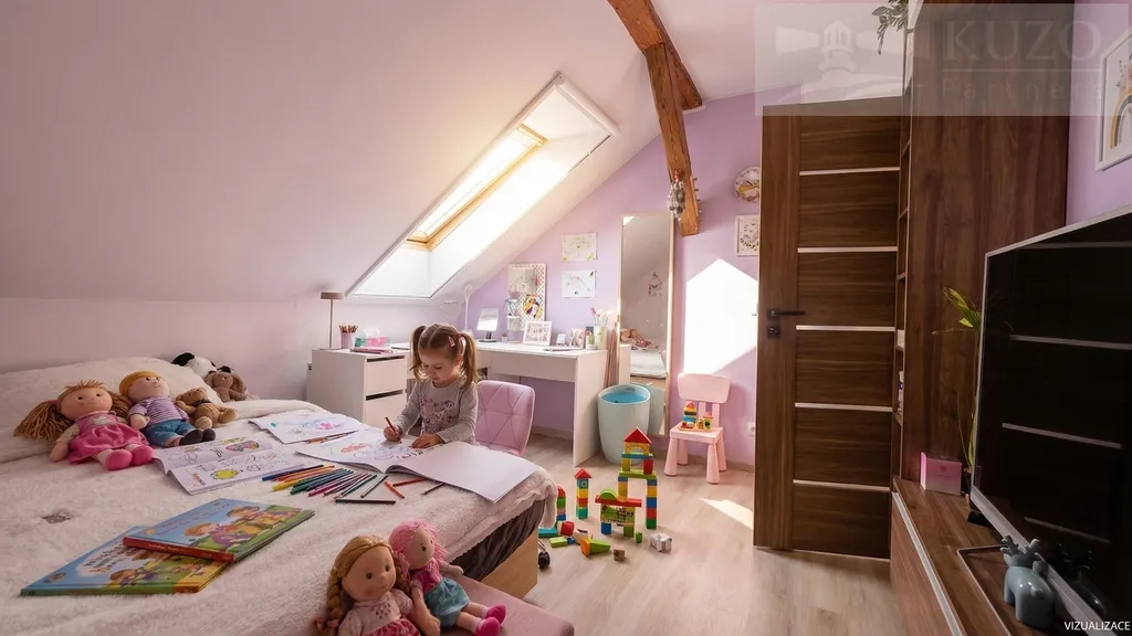 V patře najdete podkrovní obývací pokoj s přiznanými trámy, dvě klasické ložnice (jedna s velkou šatnou) a jeden „kouzelný pokoj“. I když svými rozměry (pod 7 m²) nesplňuje tabulky pro ložnici, díky palandě je to nejoblíbenější místo pro hosty nebo dětské sny. Horní patro doplňuje druhá koupelna se sprchovým koutem a druhou toaletou.