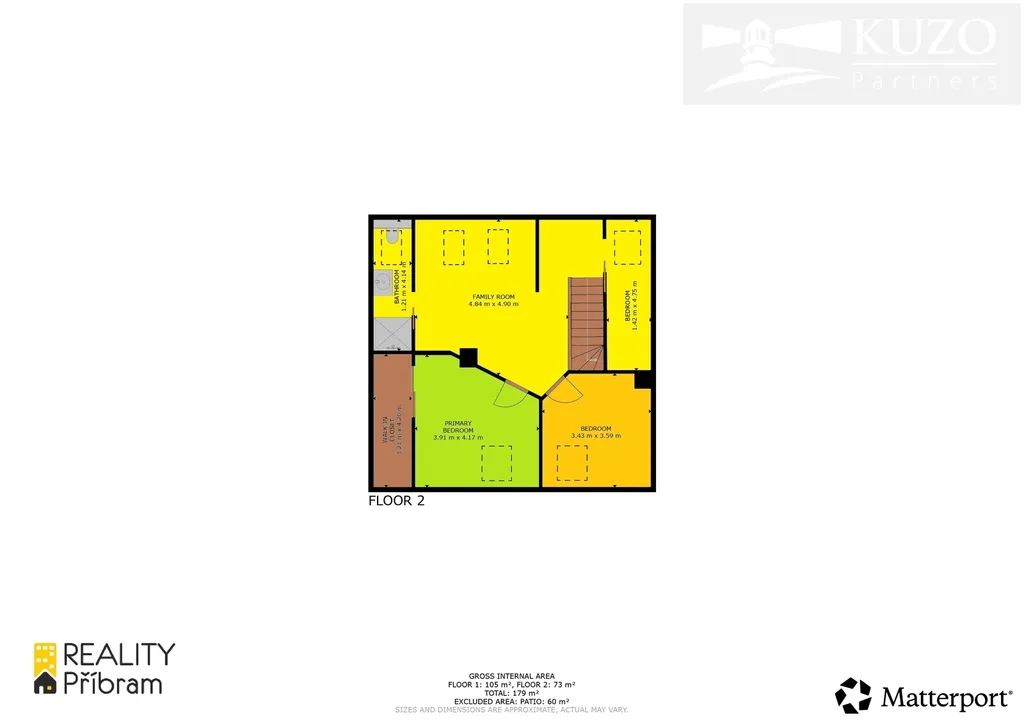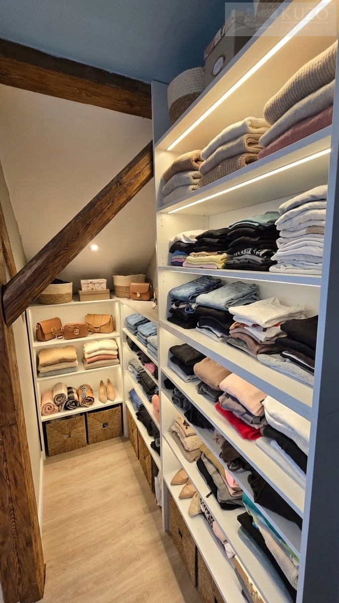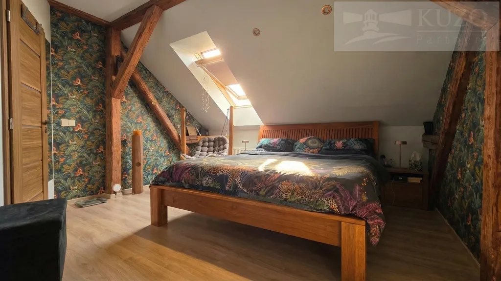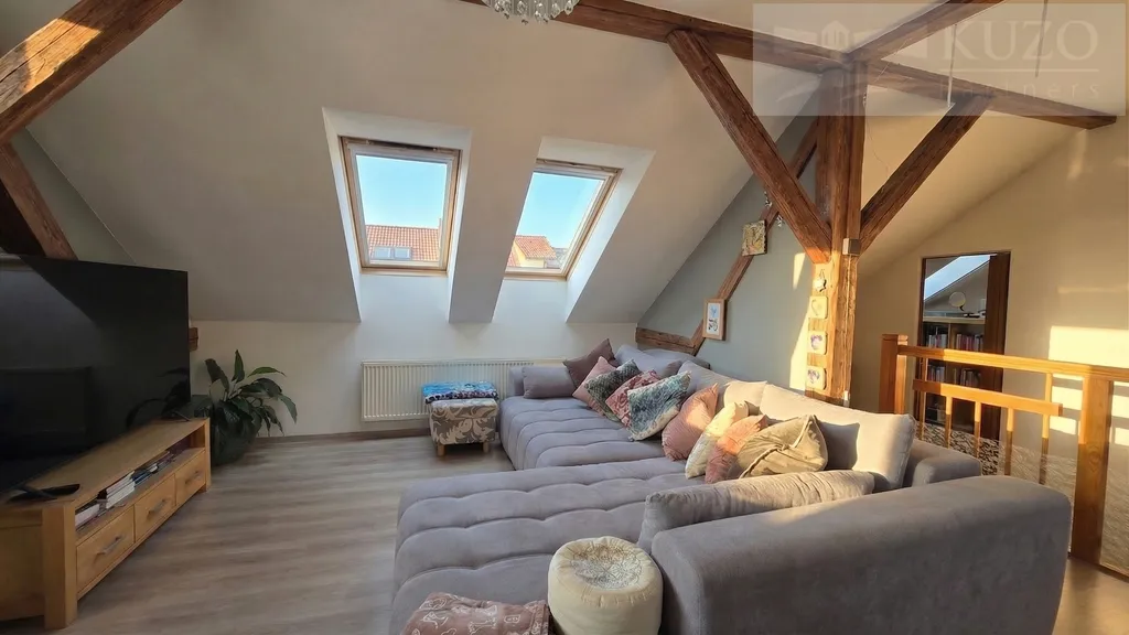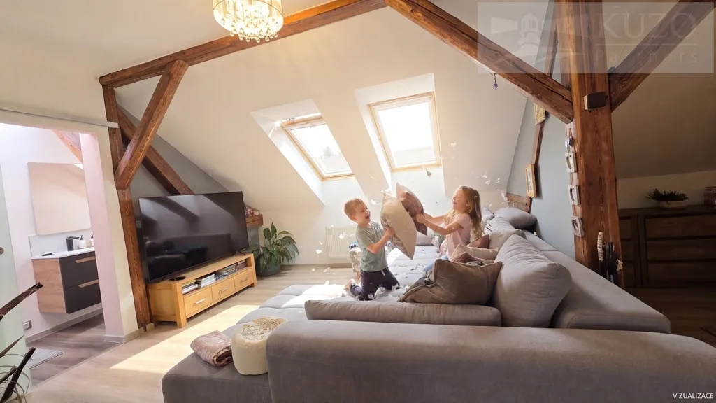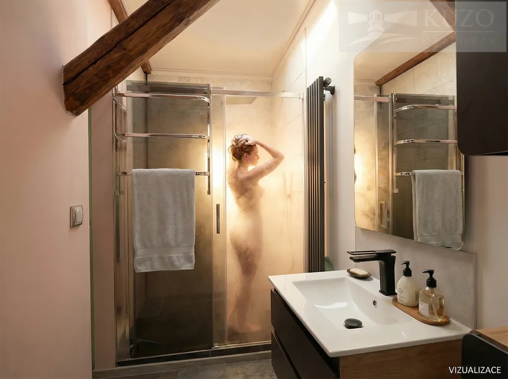 V patře najdete podkrovní obývací pokoj s přiznanými trámy, dvě klasické ložnice (jedna s velkou šatnou) a jeden „kouzelný pokoj“. I když svými rozměry (pod 7 m²) nesplňuje tabulky pro ložnici, díky palandě je to nejoblíbenější místo pro hosty nebo dětské sny. Horní patro doplňuje druhá koupelna se sprchovým koutem a druhou toaletou.
