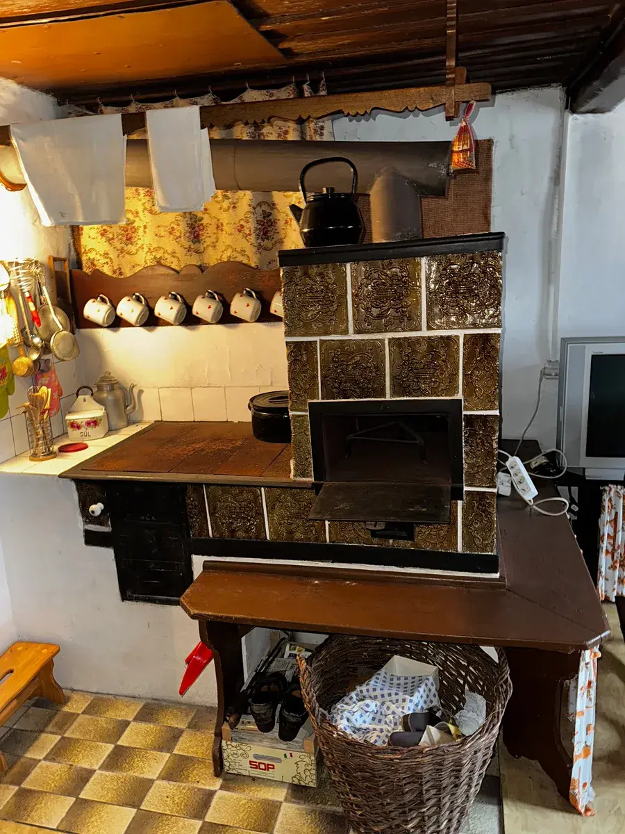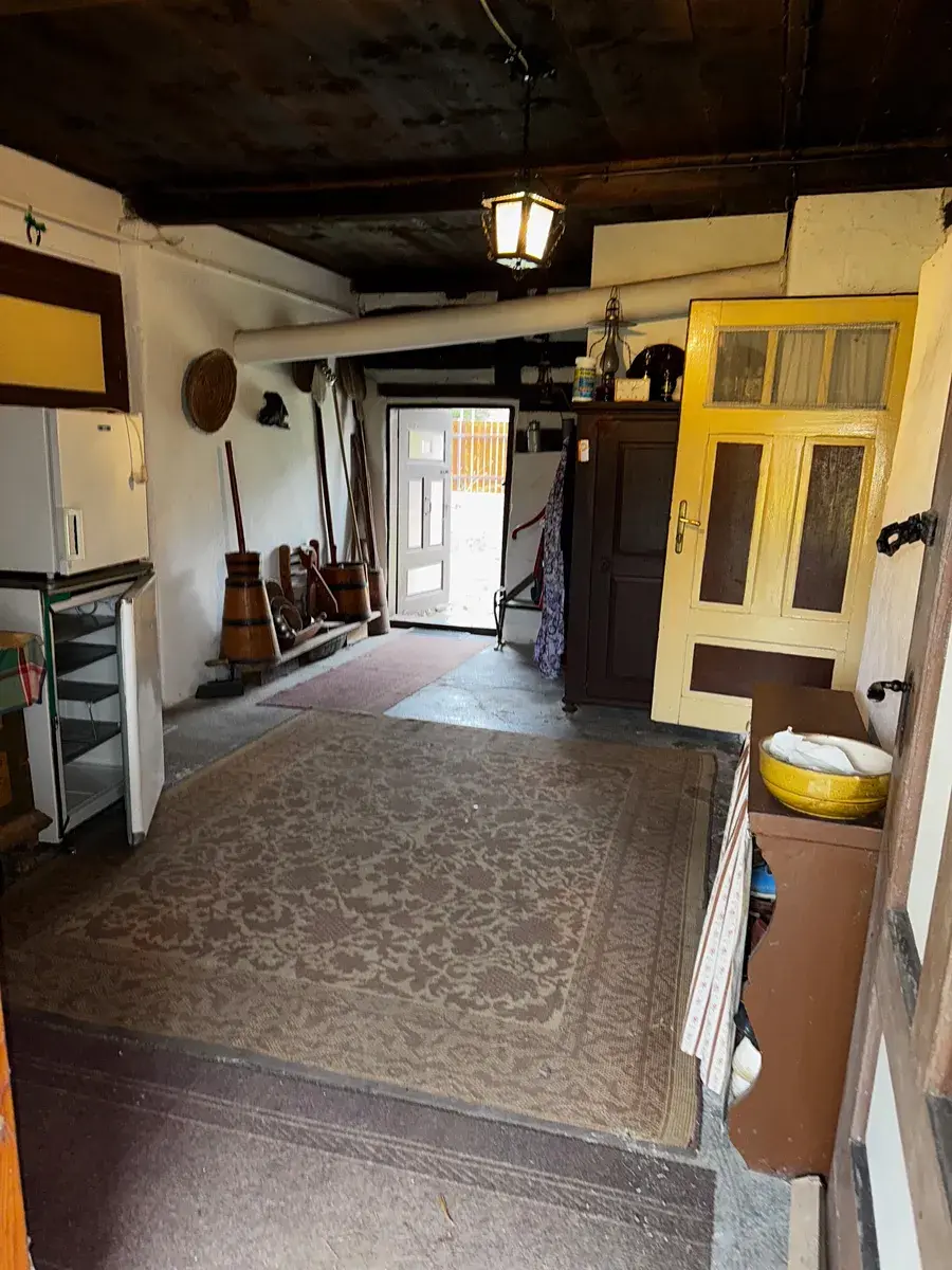Srdcem chalupy je severní křídlo, které slouží jako plnohodnotná obytná část. Hned po vstupu vás přivítá prostorná vstupní předsíň, která přirozeně navazuje na ostatní místnosti. Dominantou interiéru je bezpochyby obytná kuchyně s kachlovými kamny a pecí – místo, kde se v zimních večerech sbíhá celá rodina, kde vůně domácího pečení splývá s teplem praskajícího dřeva a kde čas prostě stojí. Tato místnost sama o sobě je důvodem, proč do chalupy přijít a proč se do ní zamilovat.