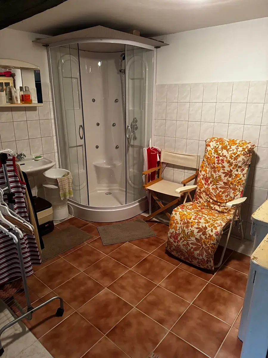 Obytná část dále nabízí pokoj, koupelnu a samostatné WC. Koupelna vznikla citlivou přeměnou původního chlívku a je vybavena sprchovým koutem, umyvadlem a splachovacím WC. Ohřev vody zajišťuje spolehlivý elektrický bojler, přičemž v kuchyni je k dispozici také praktický průtokový ohřívač.