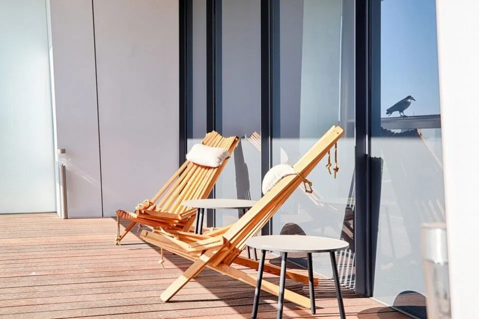 Dispozice bytu zahrnuje vstupní halu, otevřený prostor obývacího pokoje s kuchyní v bílém designu a jídelnou, s přímým výstupem na ochozí terasu, dvě samostatné ložnice rovněž s výstupy na terasu, dvě koupelny první s vanou, sprchovým koutem, toaletou a bidetem, druhou se sprchovým koutem a toaletou, samostatnou toaletu, dostatek úložných prostor a úklidovou místnost s na míru zhotovenou šatnou. Celý byt lemují ochozí terasy, přístupné ze všech pokojů.