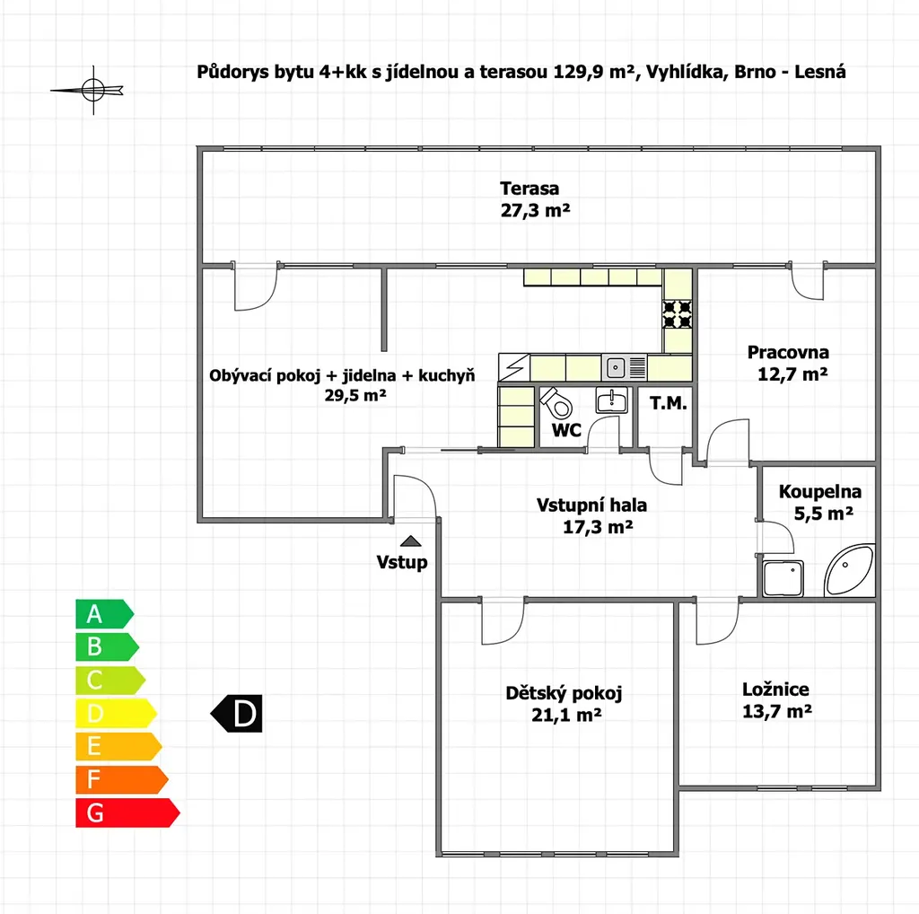 Celková užitná plocha bytu činí 129,9 m².(z toho terasa 27,3 m²)