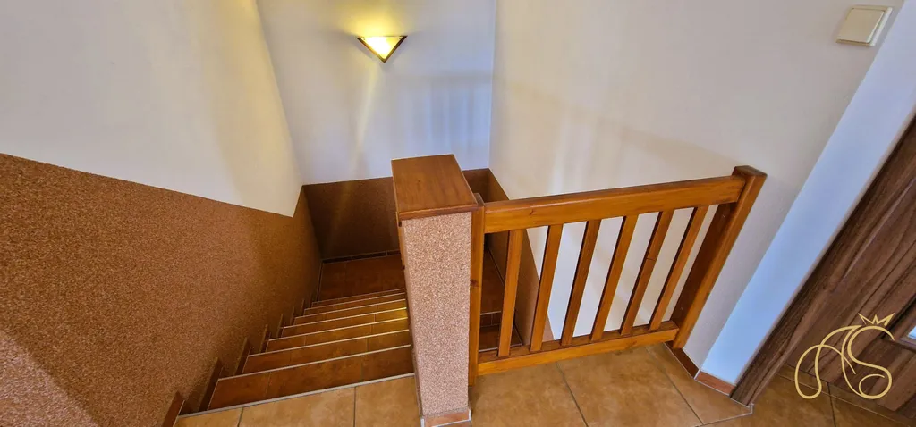 V přízemí se nachází obývací pokoj společný s jídelnou a kuchyní, dále pokoj pro hosty (pracovna), prádelna, garáž a toaleta. V krásné vstupní chodbě je uprostřed schodiště do podkroví, kde jsou další 4 pokoje a velká koupelna s toaletou.
