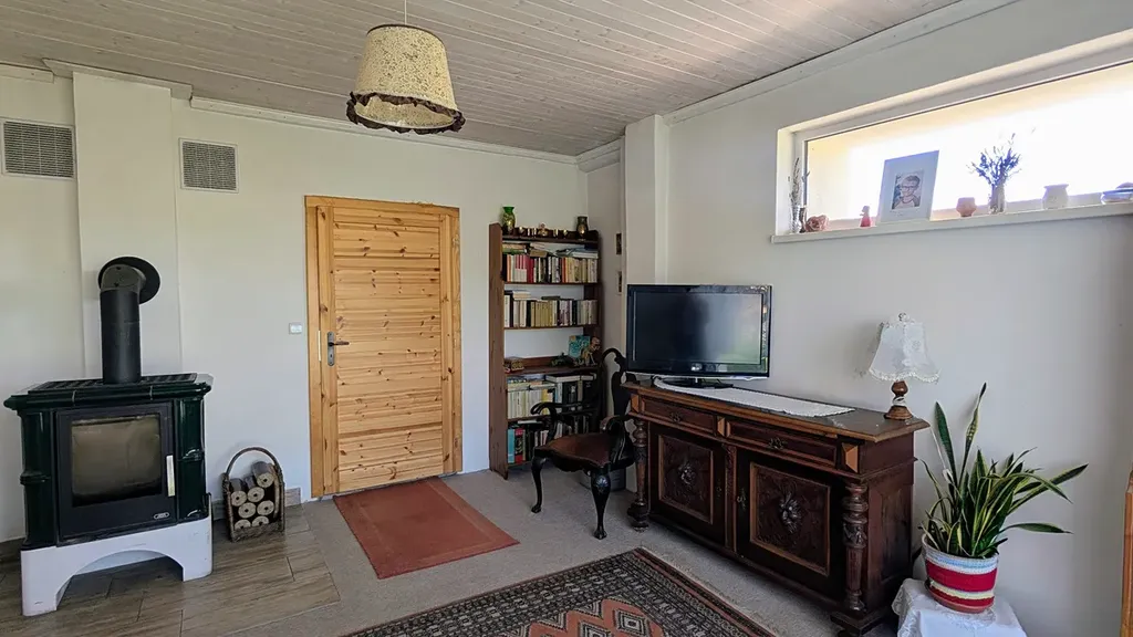 Obývací pokoj s kachlovými kamny s rozvody tepla do dalších místností vytváří srdce celého domu a zajišťuje příjemné teplo v chladnějších měsících. Velkoformátové okno navíc přivádí do prostoru dostatek denního světla. Na obývací pokoj navazuje ložnice s vlastním vstupem na zahradu prostřednictvím francouzského okna.