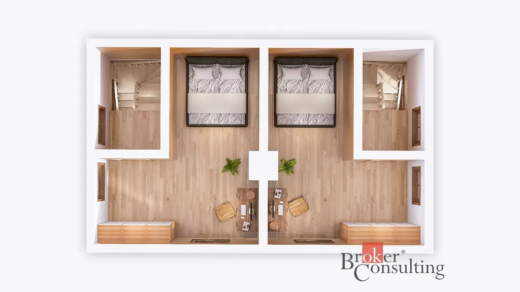 V roubence se nachází dva samostatné apartmány, každý s vlastní koupelnou, spací částí, kuchyní na míru s obývacím pokojem. Dispozice tak umožňuje komfortní bydlení nebo pronájem dvou nezávislých jednotek.