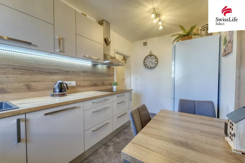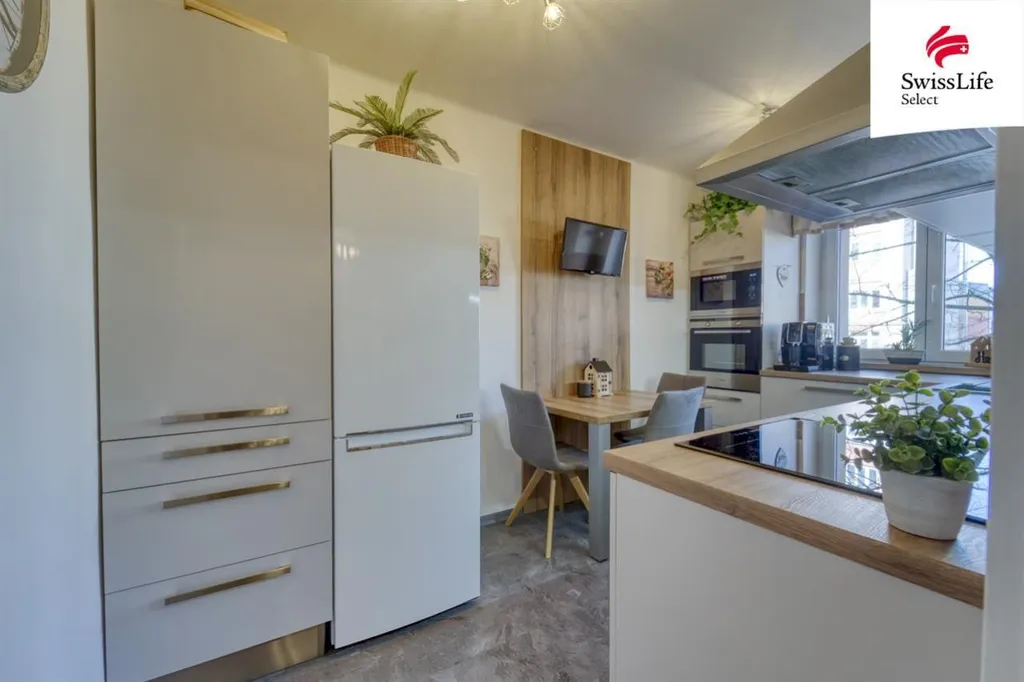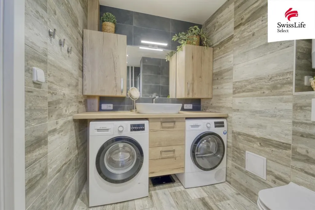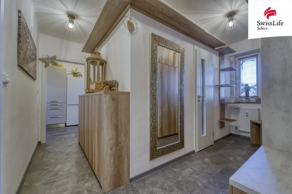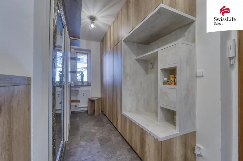Dominantou bytu je kuchyňská linka na míru a elegantní koupelna, doplněné vestavnými skříněmi v předsíní, které maximálně využívají prostor. Stačí se jen nastěhovat.