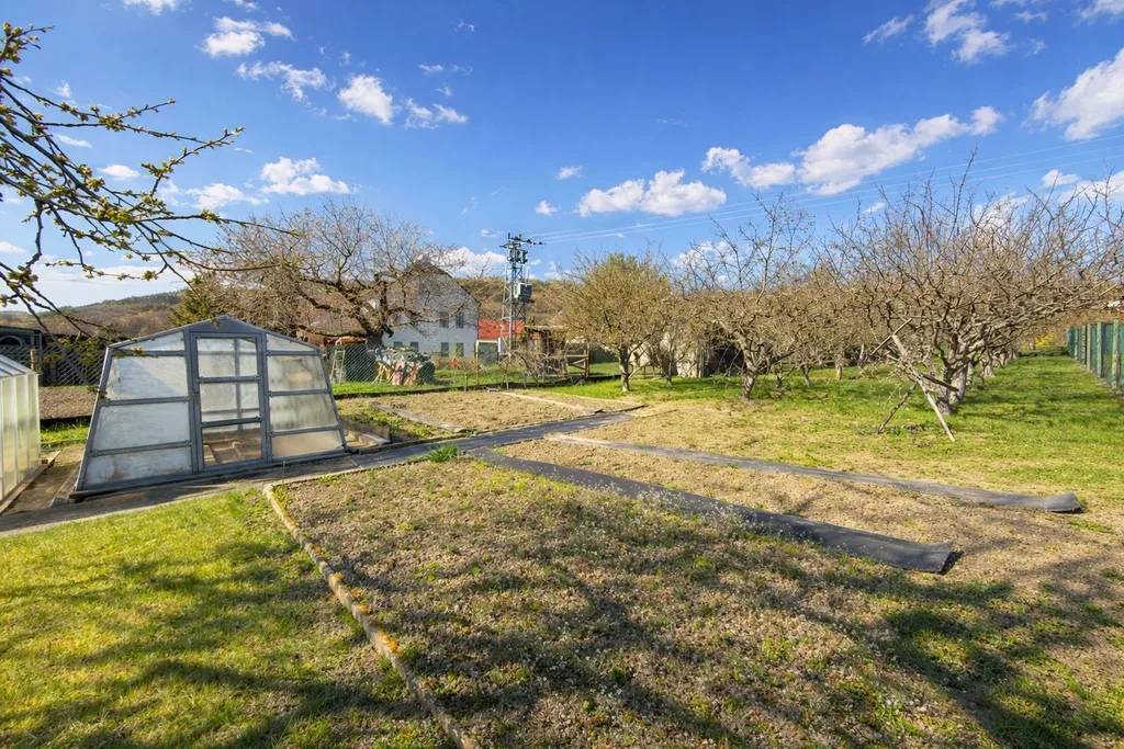 Celková výměra pozemku je cca 1.238 m², z toho zahrada tvoří přibližně 991 m². Na pozemku se nachází také užitková studna, ovocný sad se stromy (třešně, švestka, višeň, jabloně), dále králíkárna, kůlny, hospodářské stavby, černá kuchyň, malý sklep, několik přístaveb a velká garáž pro dva vozy. Nemovitost tak nabízí opravdu široké možnosti využití a velký potenciál pro někoho, kdo hledá prostor a zázemí.