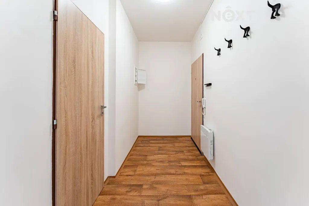 Vytápění bytu zajišťují elektrické přímotopy, ohřev vody je řešen bojlerem. K bytu náleží sklepní kóje, která poskytuje další úložný prostor.