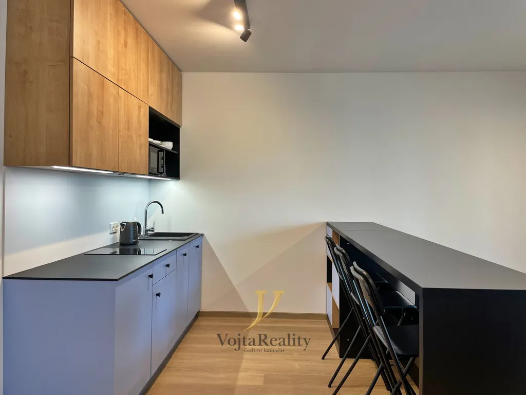 Dispozice bytové jednotky nabízí vstupní chodbu s botníkem a vestavěnou šatní skříní, koupelnu se sprchovým koutem a toaletou a obývací pokoj s kuchyňskou linkou. Kuchyňská linka je vybavena základními spotřebiči (myčka nádobí, dvouzónová indukční varná deska, digestoř, lednička, mikrovlnná trouba).