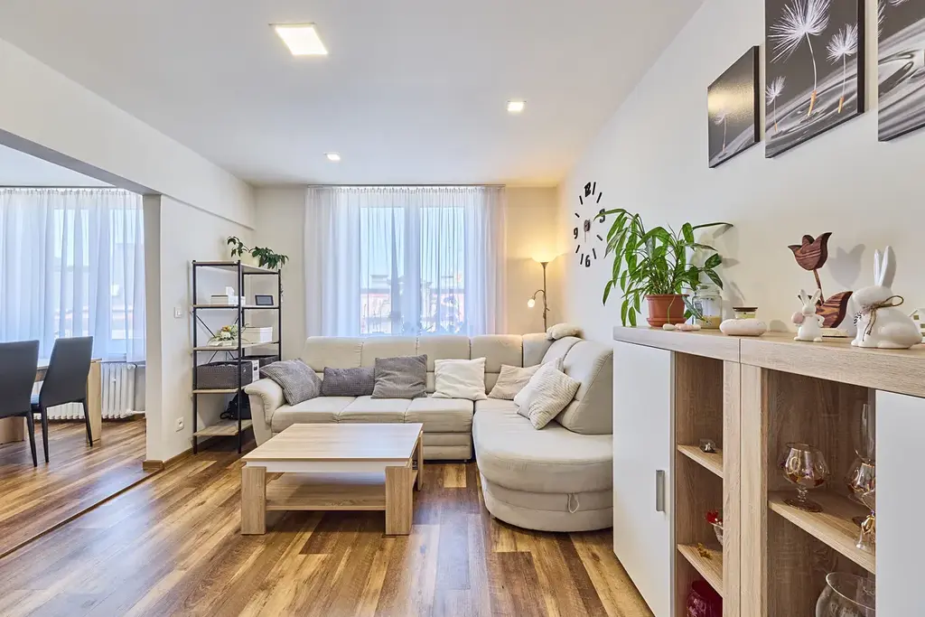 Dispozice bytu: předsíň s vestavěnými skříněmi, po pravé straně je obývací pokoj a z něho vstup do kuchyně s jídelním koutem. V předsíni je praktická komora, dále koupelna se sprchovým koutem, samostatné WC. V levé části bytu je ložnice a prostorný dětský pokoj. K bytu patří sklep o nadstandardní velikosti 7m2 umístěný v 1.PP domu. Byt je ideální pro rodinu s dětmi.