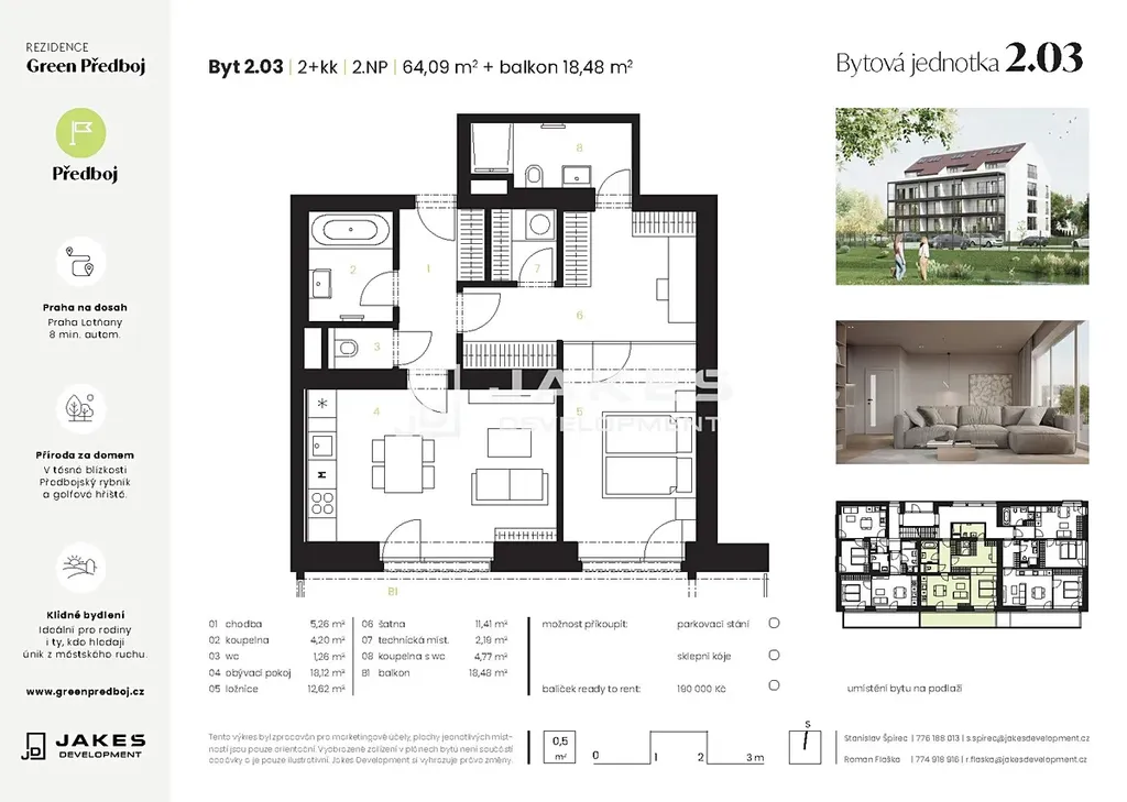 Nabízíme k prodeji byt 2+kk o velikosti 64,09 m² s balkonem o velikosti 18,48 m2, nacházející se v 2. nadzemním podlaží Rezidence Green Předboj. Byt bude dokončen ve vysokém standardu – kvalitní vinylové podlahy, moderní interiérové dveře a elegantní koupelna s keramickým obkladem a sanitou značky Laufen. Komfort zajišťuje podlahové vytápění, které přispívá k příjemné atmosféře i nízkým provozním nákladům.