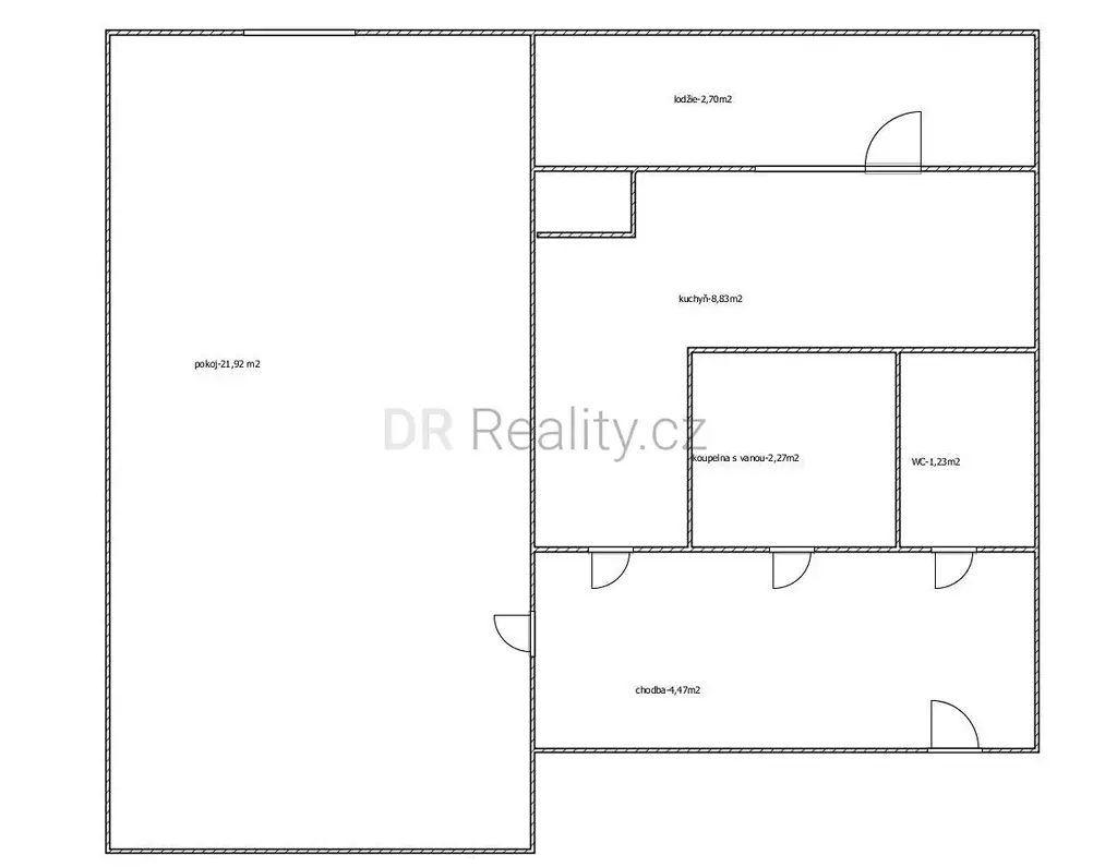 Dispozice bytu: vstupní chodba se samostatnými vstupy do koupelny, WC, do prostorného pokoje a kuchyně se vstupem na lodžii.