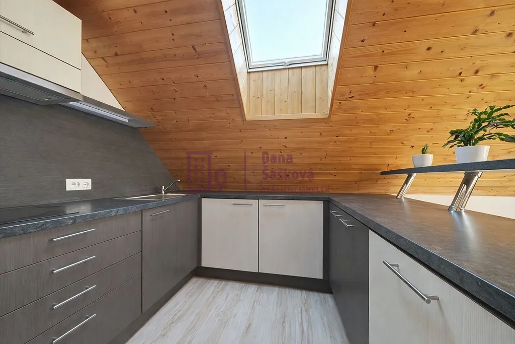 Interiér je vybavený kuchyňskou linkou s vestavěnou varnou deskou a digestoří. Další vybavení viditelné na fotografiích patří nynějšímu nájemníkovi a není součástí pronájmu.