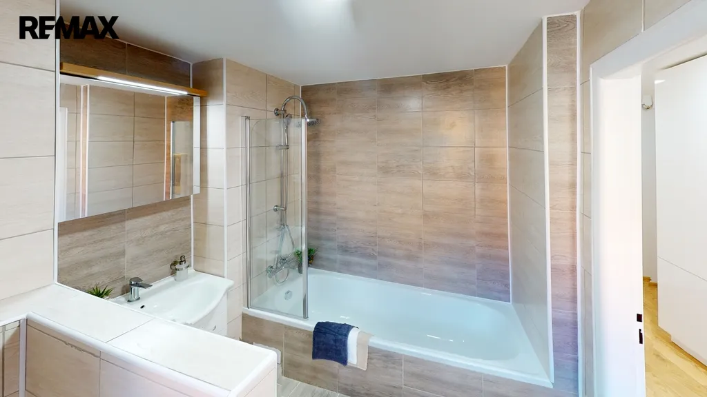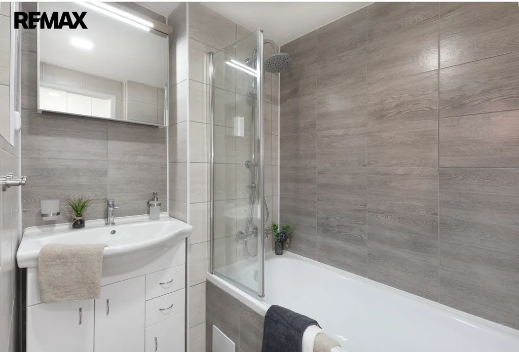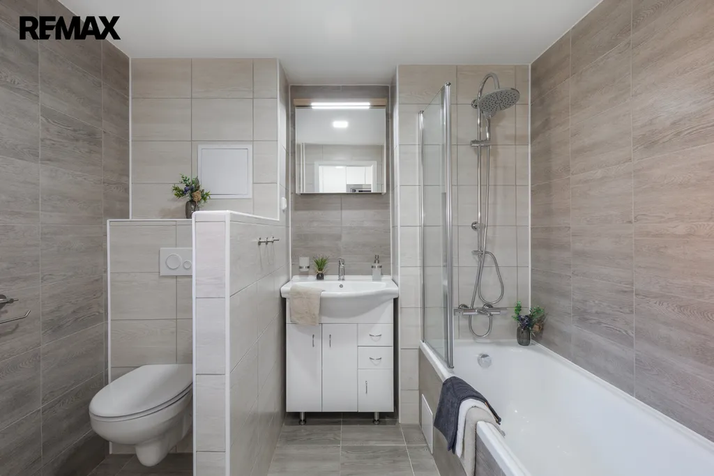 ✅ Koupelna spojená s WC, s vanou se zástěnou pro příjemnou koupel i sprchování, umyvadlem, LED osvětlením s galerkou / okno