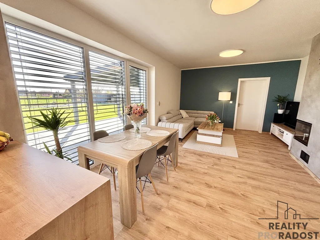 Dům je velmi hezky dispozičně řešený. V domě je vstupní chodba s vestavěnou skříní, velký prosluněný obývací pokoj s kuchyňským koutkem. Kuchyně je zhotovena na míru a je vybavena spotřebiči (indukční deska, trouba, mikrovlnka, digestoř a myčka). V obývacím pokoji je nainstalovaná klimatizace a krbová kamna. Z obývacího pokoje je vstup na velkou terasu, která je částečně zastřešená. Za obývacím pokojem je ložnice se vstupem přes balkónové dveře také na terasu. Dále jsou v domě 2 další neprůchozí pokoje, technická místnost, samostatné WC a velká koupelna s dvěma umyvadly, vanou, sprchovým koutem a WC. V domě jsou instalované venkovní žaluzie. Dům je napojen na elektřinu a obecní vodu, odpad je sveden do čističky. Vytápění a ohřev vody zajišťuje tepelné čerpadlo.