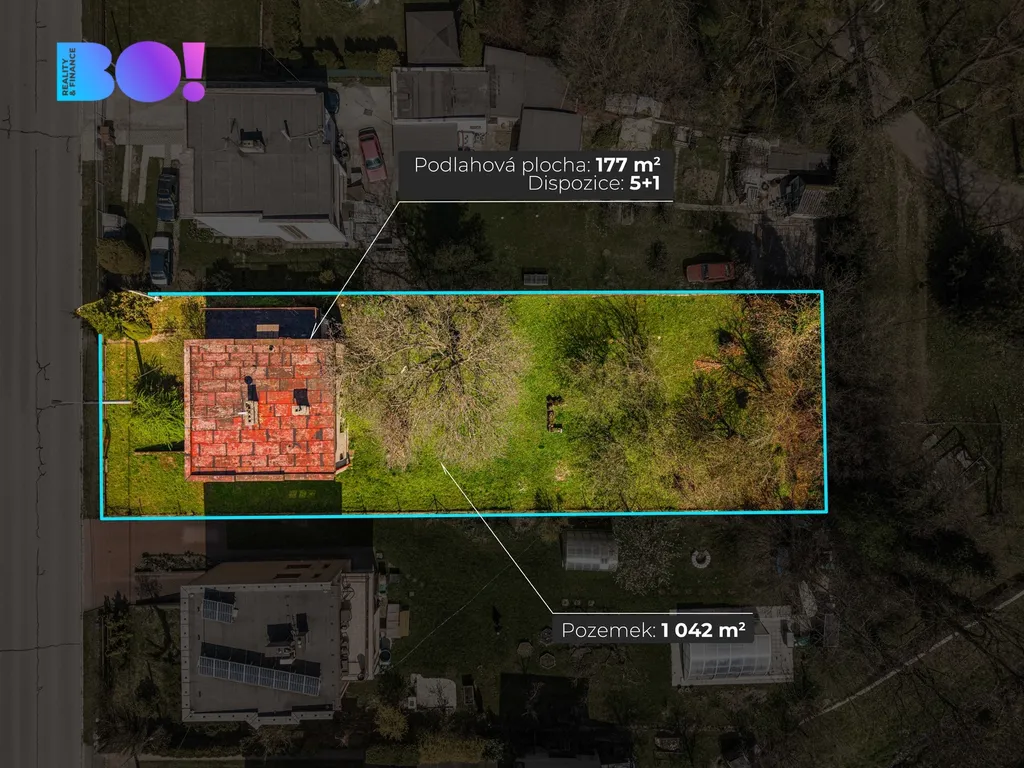 Pozemek o velikosti přibližně 1 042 m² poskytuje dostatek soukromí i prostoru pro zahradu, relaxaci či další využití.